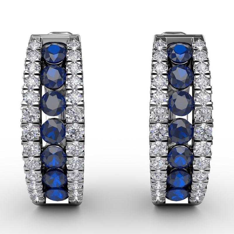 These wide sapphire and diamond channel setting hoop earrings come in a variety of material types like 14k white gold, yellow gold, rose gold and can be customized with your jeweler. Classic Fana gemstone earrings are perfect for that special woman in your life.
