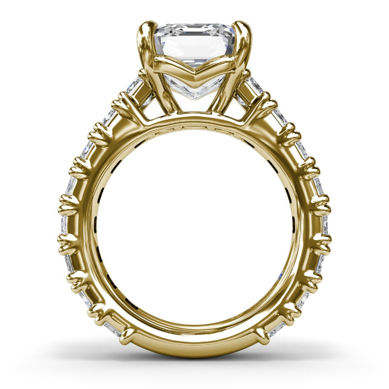 This engagement ring features a gorgeous array of 16 emerald cut diamonds exalting the center stone. This engagement ring can be special ordered in any finger size, in Platinum, 18KT & 14KT gold and can be customized for any shape and size centerstone.