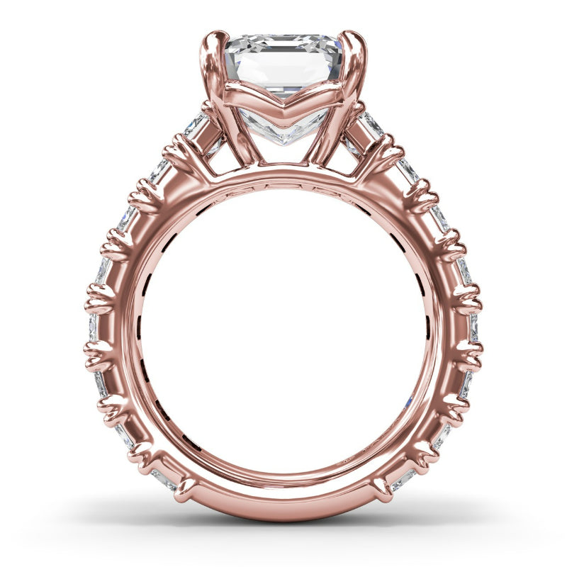 This engagement ring features a gorgeous array of 16 emerald cut diamonds exalting the center stone. This engagement ring can be special ordered in any finger size, in Platinum, 18KT & 14KT gold and can be customized for any shape and size centerstone.