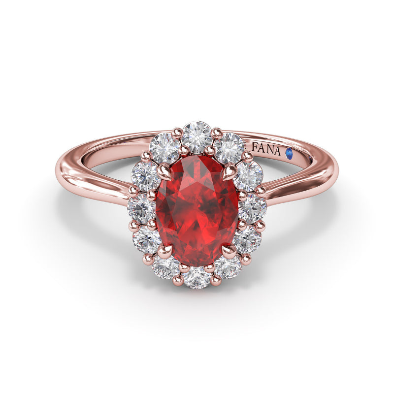 This dazzling halo ruby and diamond ring comes in a variety of material types like 14k white gold, yellow gold, rose gold and can be customized with your jeweler. Classic Fana rings are perfect for that special woman in your life.