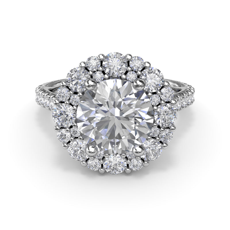 A mix of different size diamonds creates a new spin on a classic halo. This design can be customized based on stone shape and metal preference.