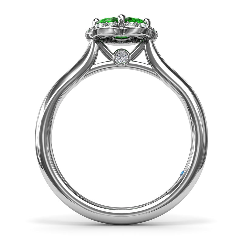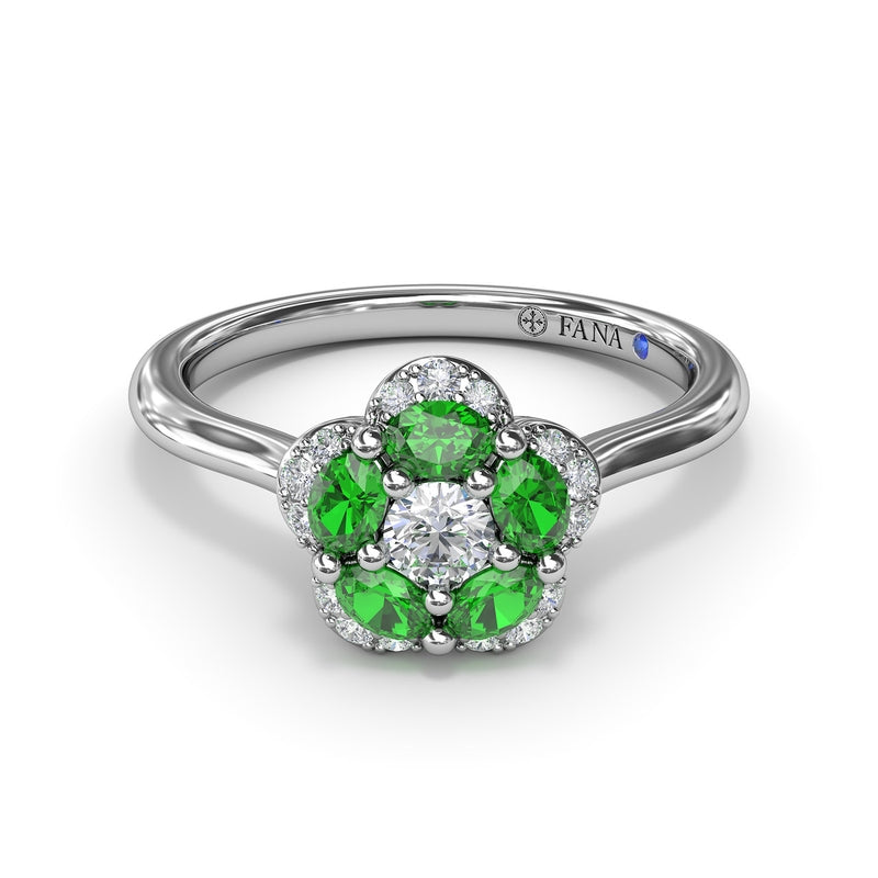 Feel the femininity with this floral emerald and diamond ring that comes in a variety of material types like 14k white gold, yellow gold, rose gold and can be customized with your jeweler. Classic Fana rings are perfect for that special woman in your life.