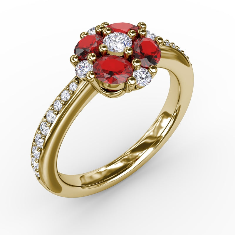 Four oval rubies encrust a center diamond for a petite floral look. This ring comes in a variety of material types like 14k white gold, yellow gold, rose gold and can be customized with your jeweler. Fana gemstone fashion rings are perfect for that special woman in your life.