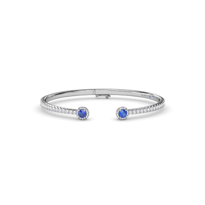 Enhance your style with this halo sapphire and diamond bangle. This bangle comes in a variety of material types like 14k white gold, yellow gold, rose gold and can be customized with your jeweler. Classic Fana gemstone bangles are perfect for that special woman in your life.