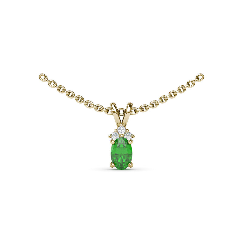 This timeless oval emerald and diamond pendant is topped with 3 round diamonds creating perfect harmony. This pendant come in a variety of material types like 14k white gold, yellow gold, rose gold and can be customized. Classic Fana pendants are perfect for that special woman in your life.