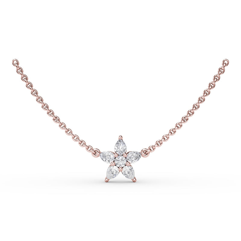 This petite floral diamond necklace comes in a variety of material types like 14k white gold, yellow gold, rose gold and can be customized with your jeweler. Classic Fana necklaces are perfect for that special woman in your life.