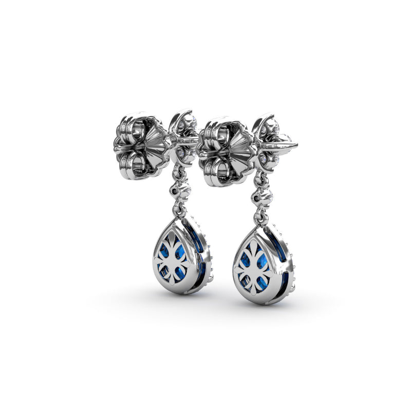 These sapphire and diamond teardrop dangle earrings are a symbol of sheer elegance. These earrings come in a variety of material types like 14k white gold, yellow gold, rose gold and can be customized with your jeweler. Classic Fana diamond earrings are perfect for that special woman in your life.