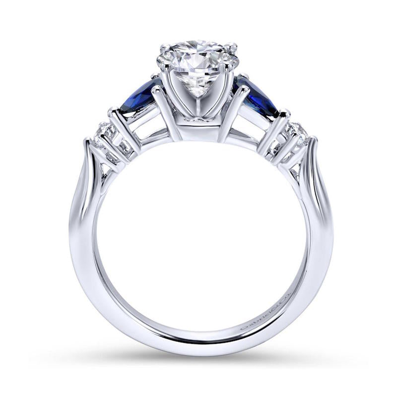 14k White Gold 3 Stone Diamond and pear shaped Blue Sapphire Gemstone Engagement Ring. SETTING ONLY; center stone not included