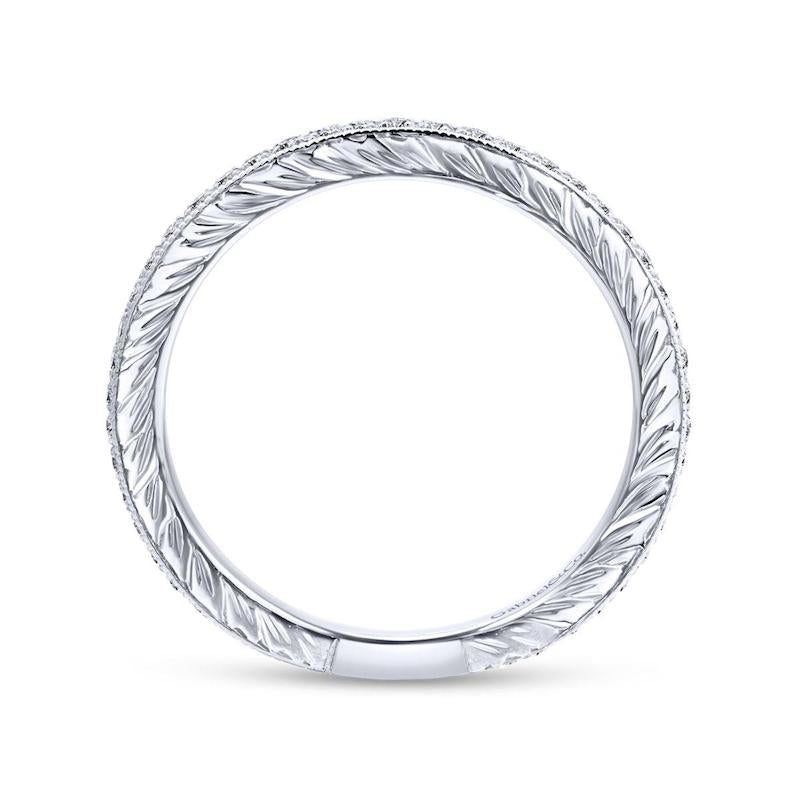 Classic and elegant, this slim stackable ring is perfect for enhancing your everyday style. A straight row of scintillating 0.21ct diamonds curves around the band for sophisticated sparkle. Engraved details elevate the profile of the 14K white gold setting.
