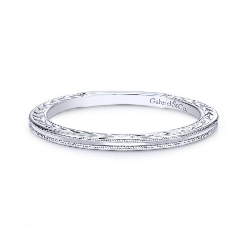 A dainty stackable ring crafted from 14K white gold with two rows of elegant milgrain detailing. The profile of the slim, straight band is adorned with eye-catching chevron engraving. A versatile style to incorporate into your stackable ring collection.