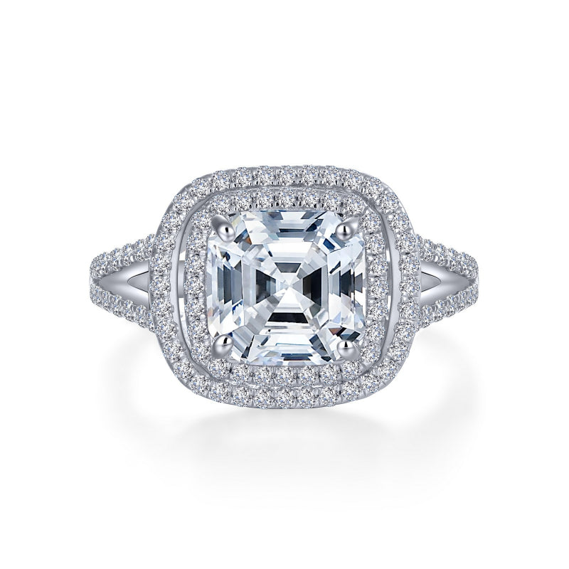 Elegant and sophisticated. This captivating split-shank ring features a Lafonn asscher-cut simulated diamond center stone, encircled with a double halo set with Lafonn's signature Lassaire simulated diamonds. The ring is in sterling silver bonded with platinum.
