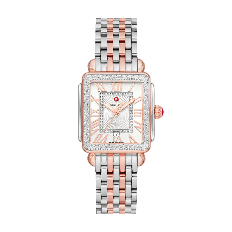 This two-tone stainless and 18K pink gold Deco Madison Mid shines with 148 hand-set diamonds on the bezel and atop the silver white sunray dial. The two-tone 18K pink gold bracelet is made specifically for the Deco Madison Mid collection and is interchangeable with any 16mm MICHELE strap.