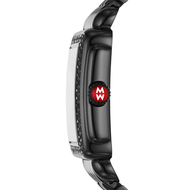 Inspired by the geometric shapes of Art Deco architecture, this noir Deco Mid shines with 126 hand-set diamonds (0.61 carat weight) on the bezel and black dial with diamonds adorned with double diamond hour markings. The signature MICHELE crown accent this stunning timepiece with a Swiss movement and the iconic seven-link noir stainless steel bracelet is interchangeable with any 16mm MICHELE strap.