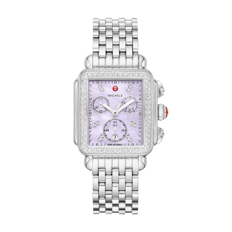 The rectangular case of the Deco Stainless Steel Diamond Watch reflects the geometric shapes identified with Art Deco architecture. This iconic timepiece features a Swiss chronograph movement features 120 brilliant hand-set diamonds (0.65 carat weight) along the bezel and lavender mother-of-pearl dial, three subeyes accented with silver foil and engraved MICHELE logos within the case walls. A stainless steel seven-link bracelet adds the finishing touch and is interchangeable with any 18mm MICHELE strap.