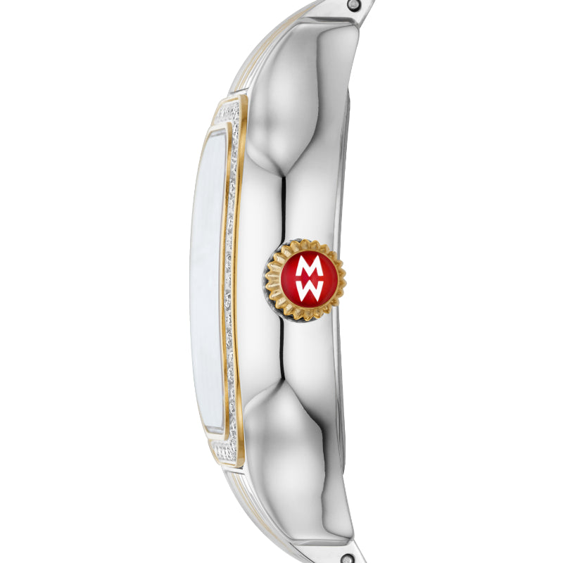 Elegant curves add modern elegance to the case of MICHELE's stunning Meggie watch that sparkles with 64 hand-set diamonds on the top ring in our signature MW pattern and a mother-of-pearl dial with diamond inner ring and signature diamond indexes. This watch features a Swiss movement and a gleaming 14mm two-tone stainless steel seven-link bracelet made specifically for the Meggie collection interchangeable with any 14mm MICHELE strap.