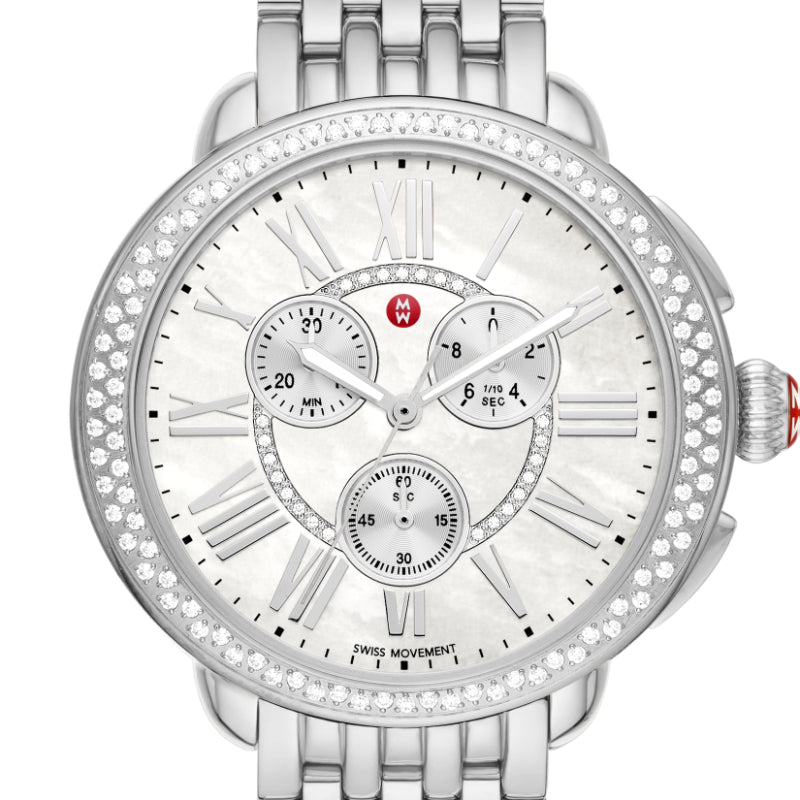 This Serein stainless diamond watch timepiece features chronograph movement, 123 brilliant hand-set diamonds (0.62 carat weight) along the bezel and white mother-of-pearl dial. Paired with a seven-link stainless bracelet, this 18mm bracelet is made specifically for the Serein and is interchangeable with any 18mm MICHELE strap.