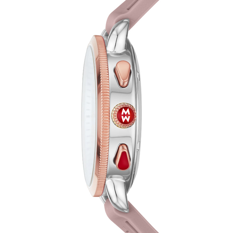 Designed with a modern silhouette, the Sporty Sport Sail features a chronograph movement, eye-catching two-tone pink gold case, white silver sunray dial with Roman numeral indexes and rose silicone strap perfect for everyday wear. The 18mm silicone strap is made specifically for the Sporty Sport Sail Collection and is interchangeable with any 18mm MICHELE strap.