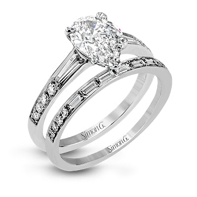 This dazzling wedding set is enhanced by .21 ctw of round white diamonds with side accents of .53 ctw of baguette cut diamonds Center stone not included.