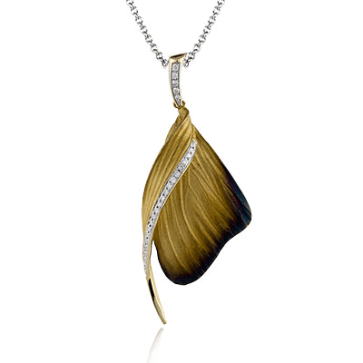 A delicate swirl of white diamonds highlights this contemporary pendant, which hangs from a diamond-encrusted ball and features an eye-catching, wood-grain design inspired by nature