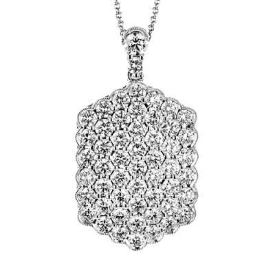 This hexagonal dog tag pendant in 18k white gold is a show stopper covered in 2.10 ctw. of brilliant white diamonds