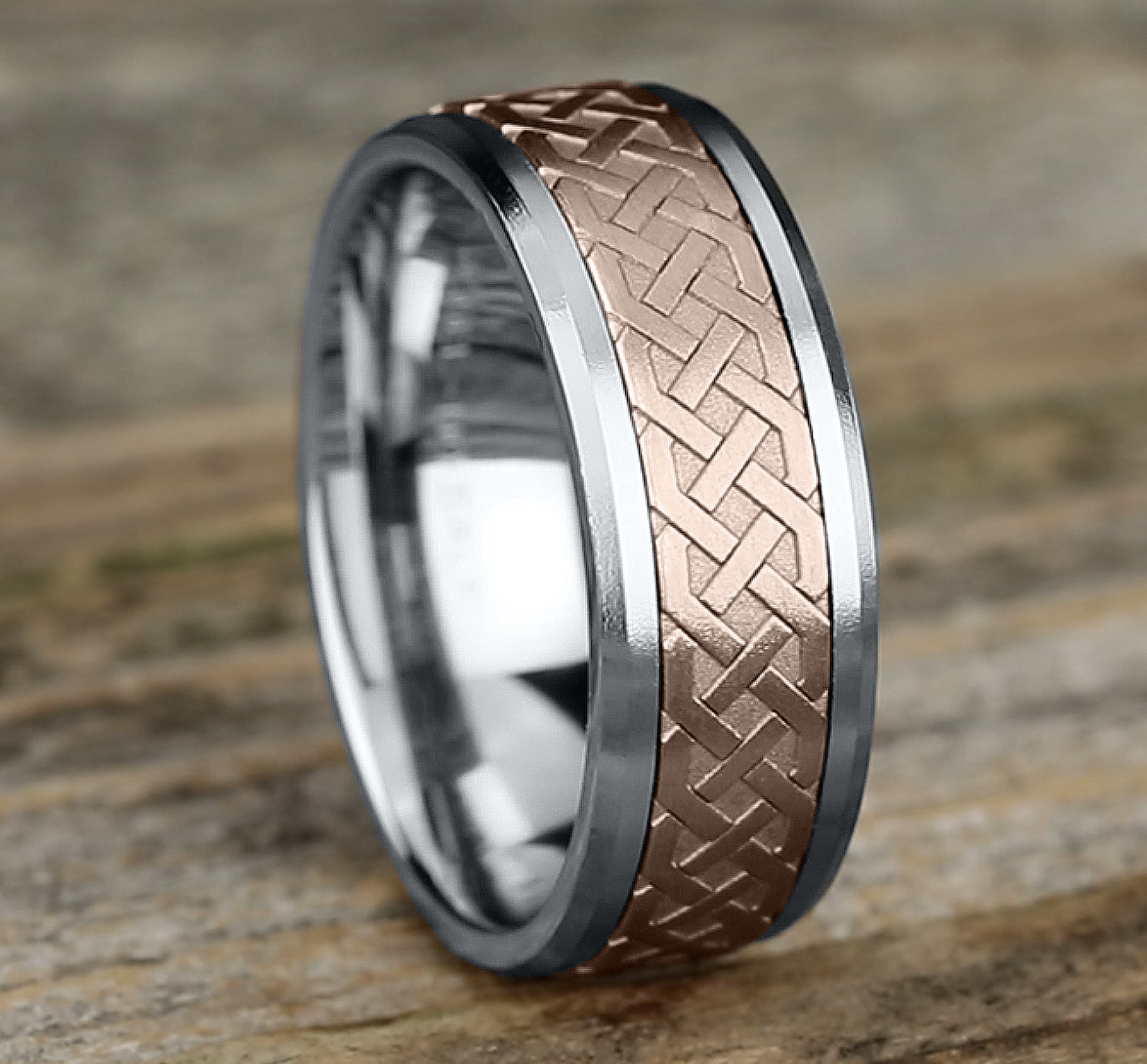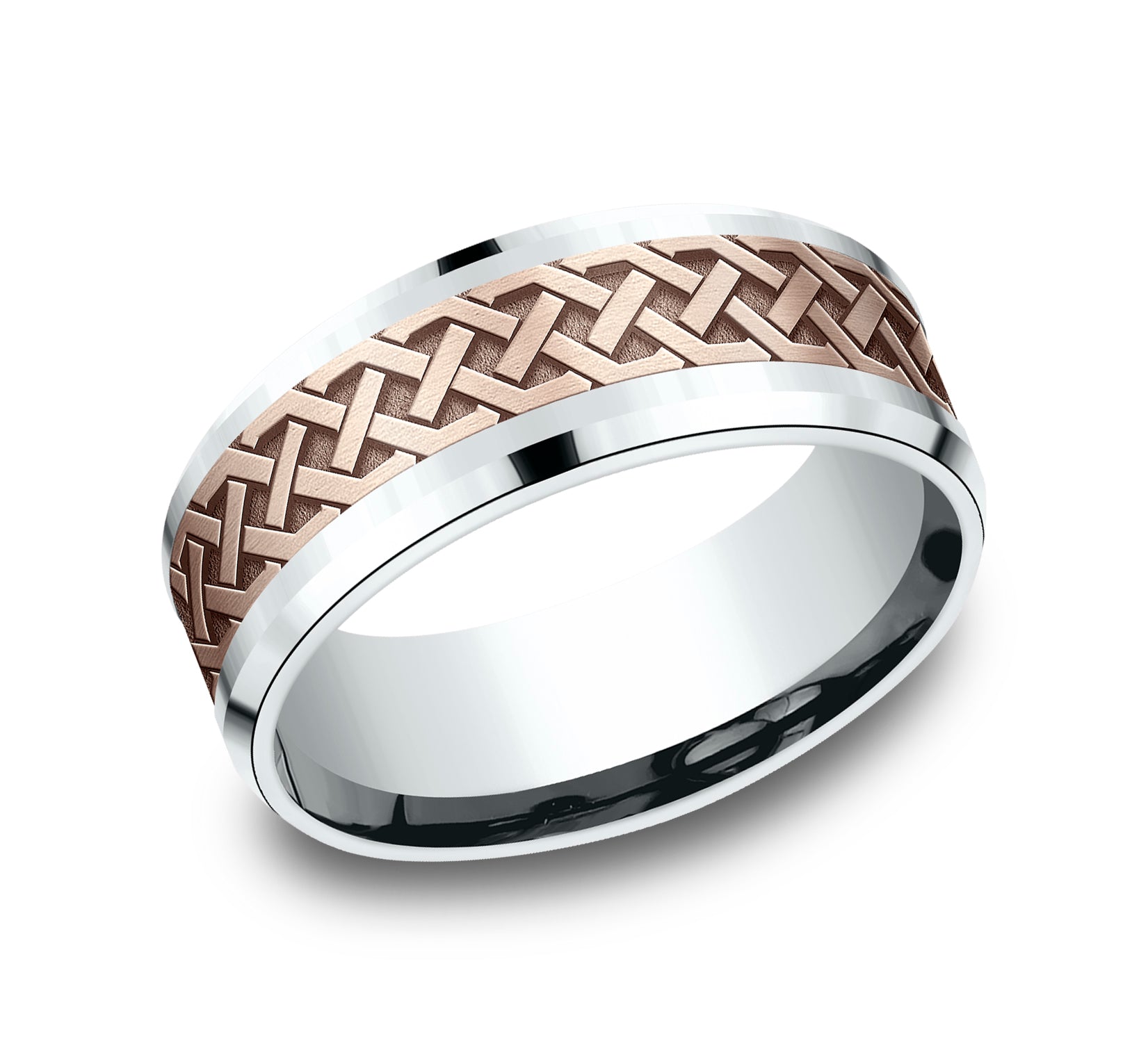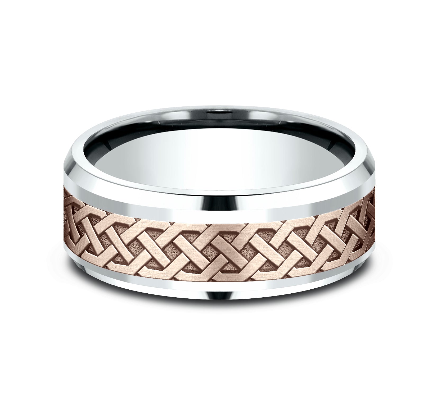 8mm, Comfort fit 14K White and Rose Gold Celtic knot patterned center, bevel edges