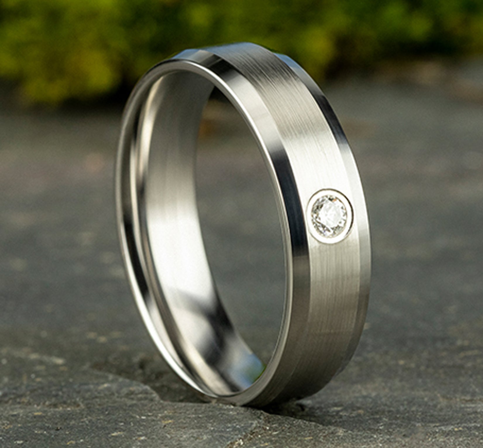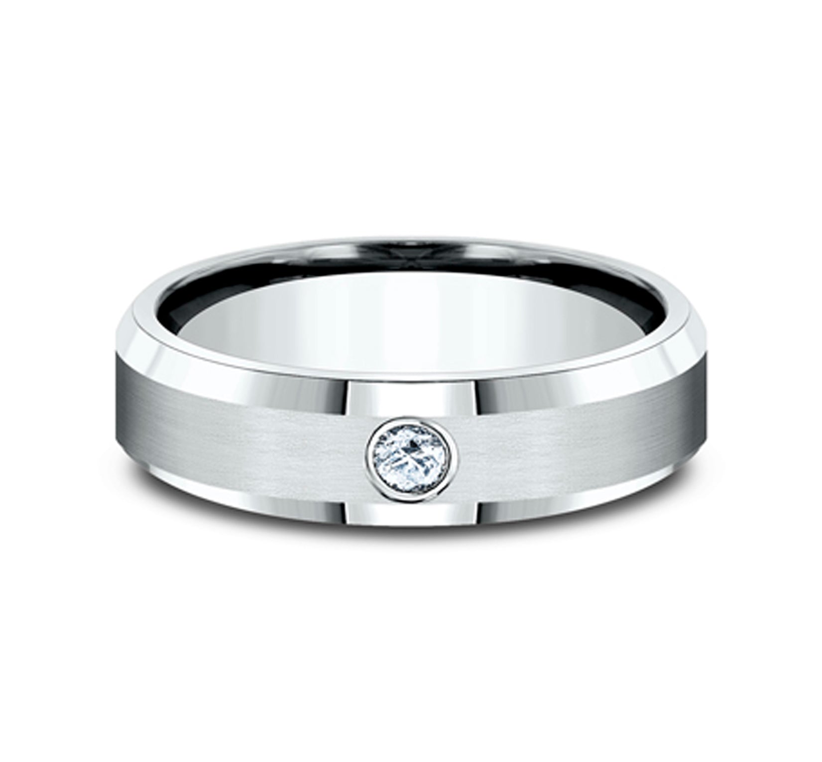 6mm, Comfort fit 14K White Gold Satin finish, polished bevel edges 1 burnish set diamond Carat weight is .08ct Clarity SI1-2, Color GH