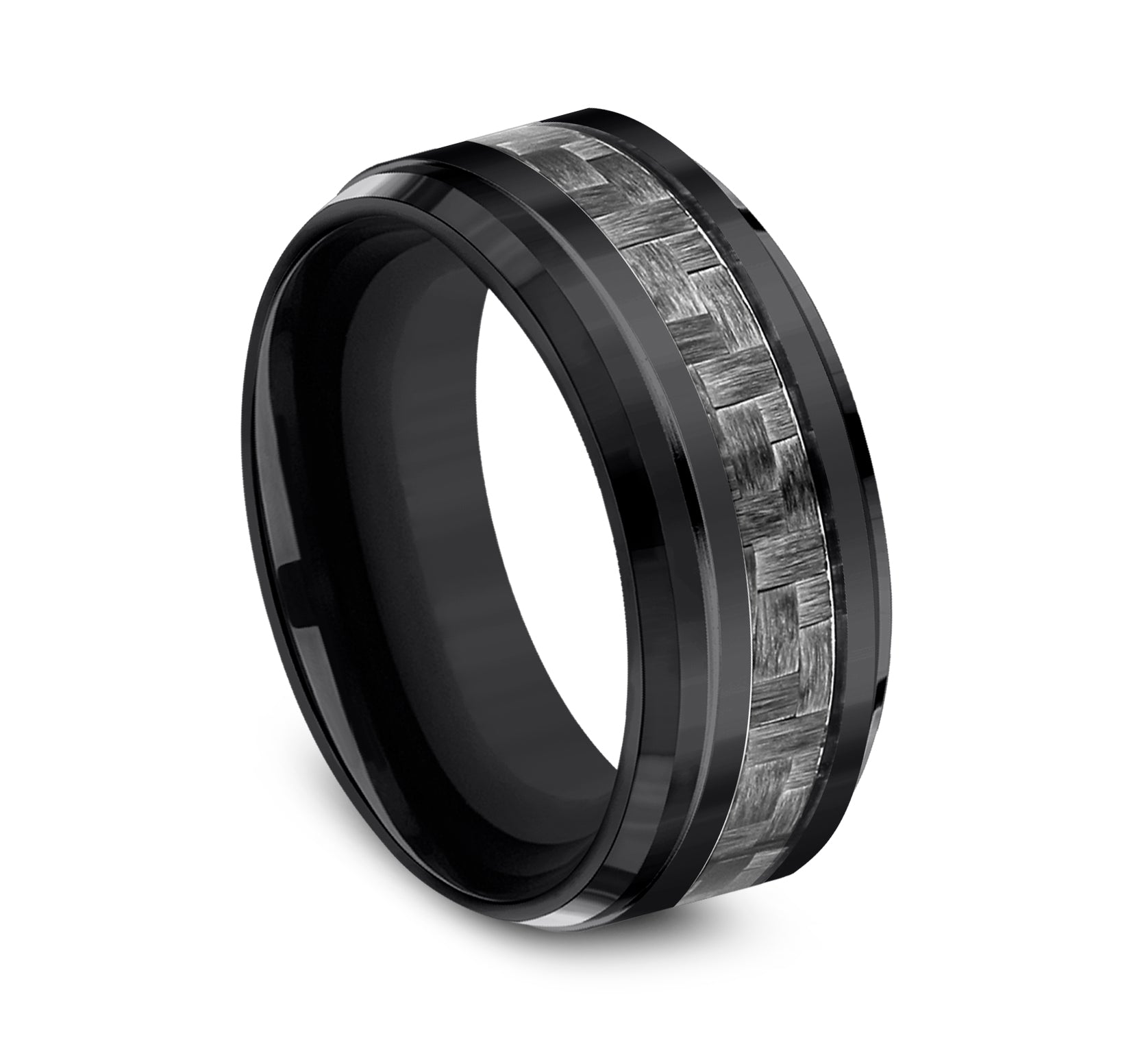 9mm, Comfort fit Black Titanium and Grey Carbon Fiber Carbon Fiber center, polished bevel edges