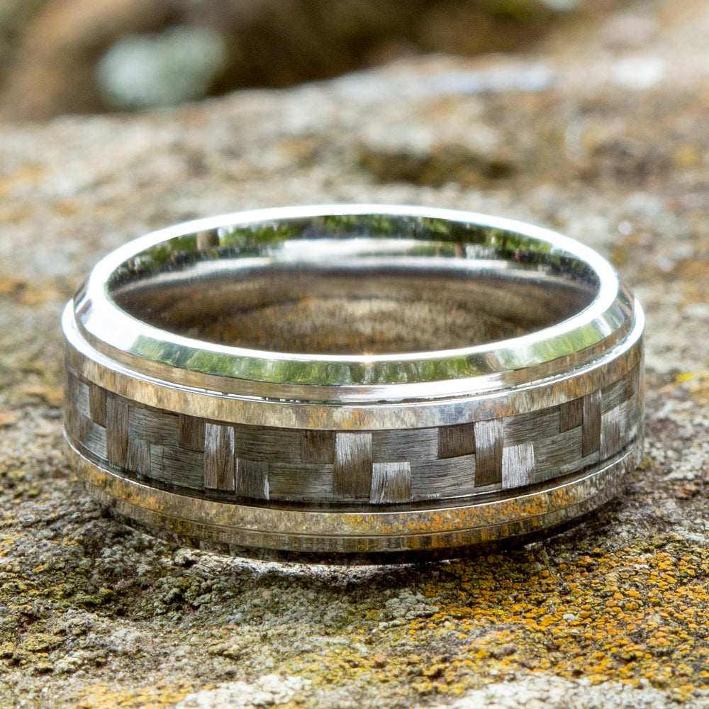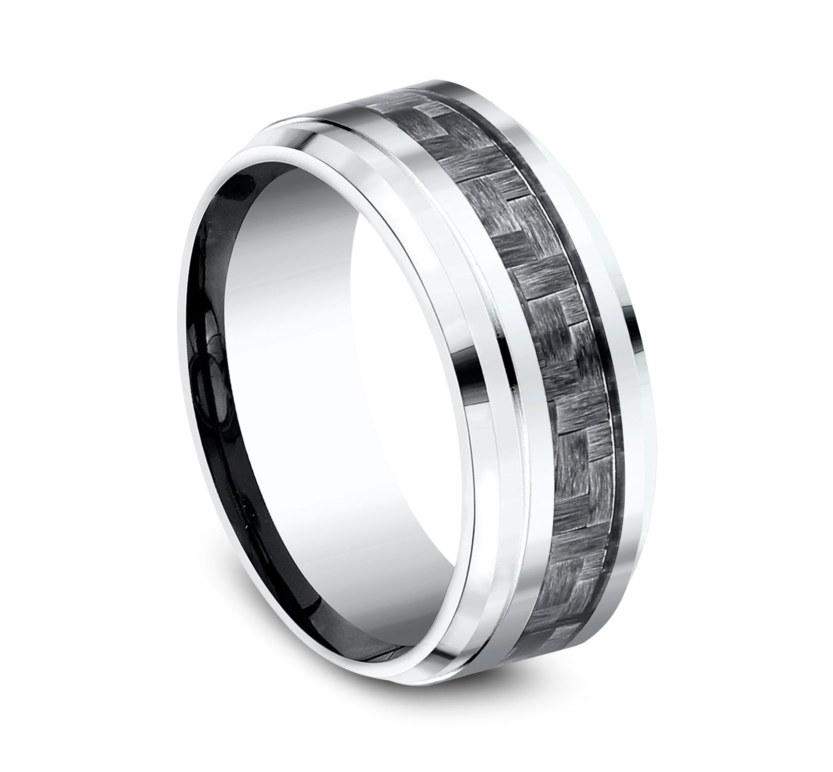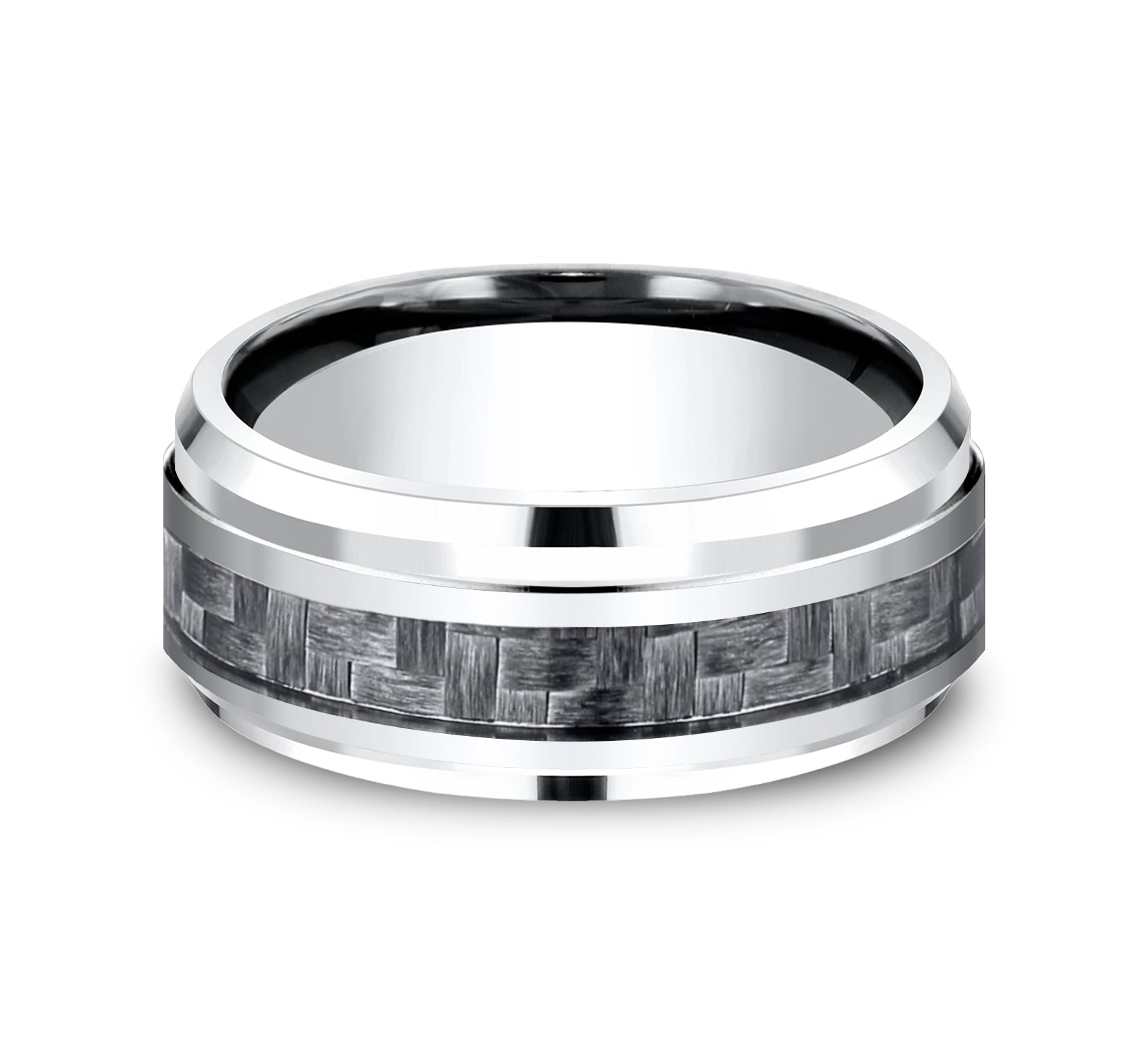 9mm, Comfort fit White Cobalt and Grey Carbon Fiber Carbon Fiber center, polished bevel edges