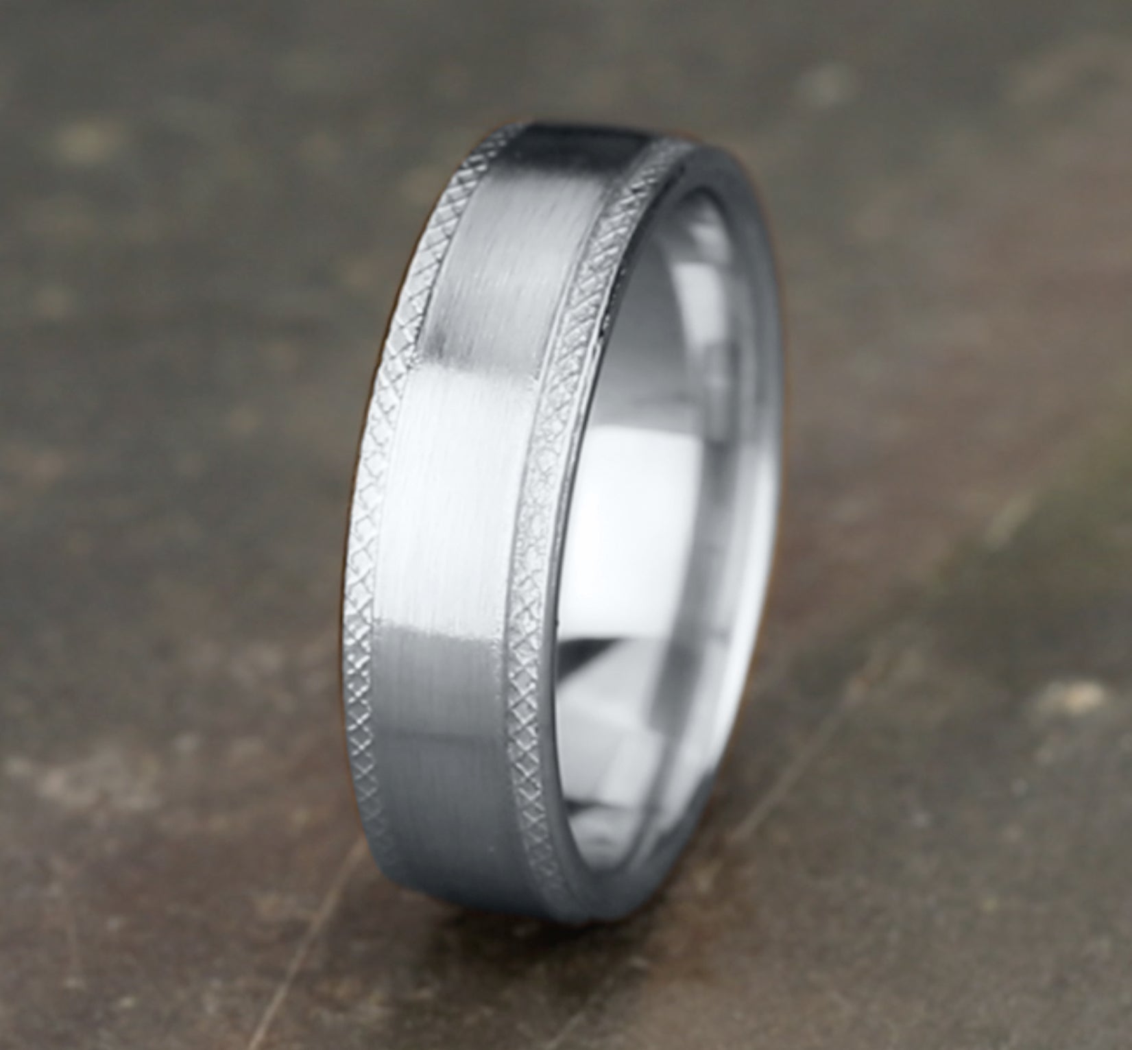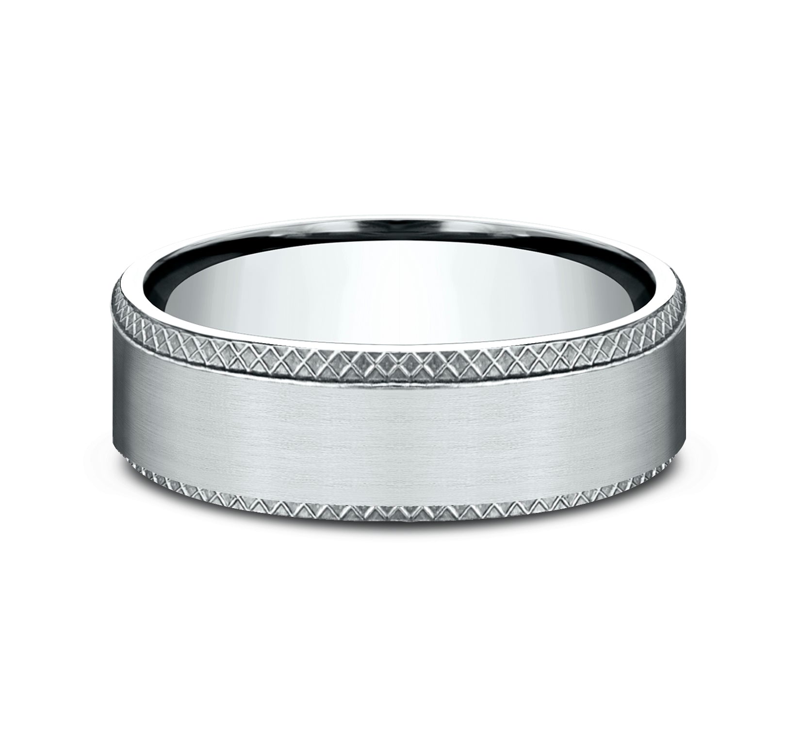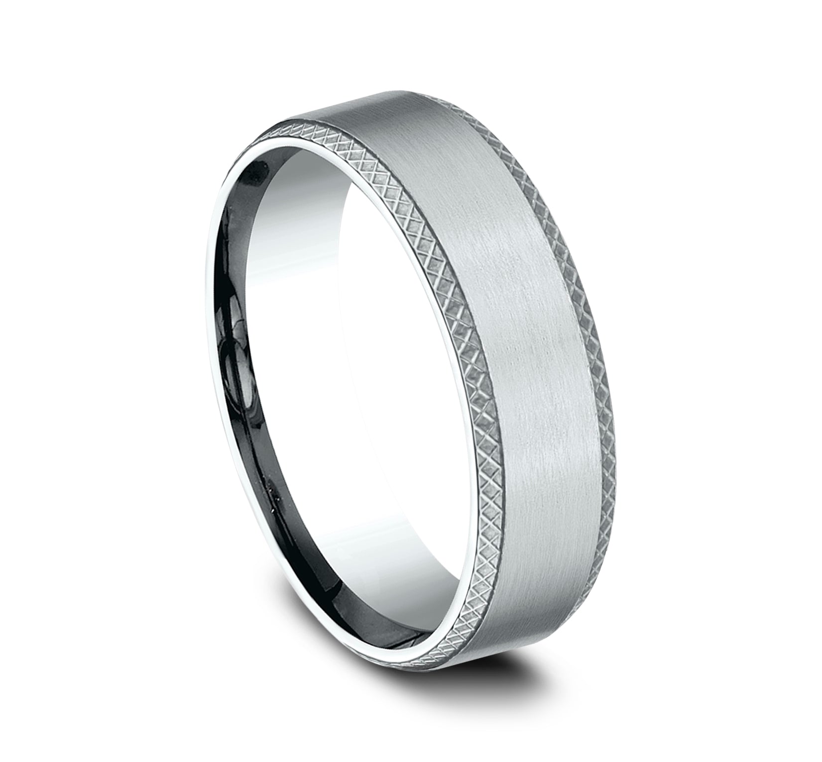 6.5mm, Comfort fit 14K White Gold Satin finish center, knurl detailed edges