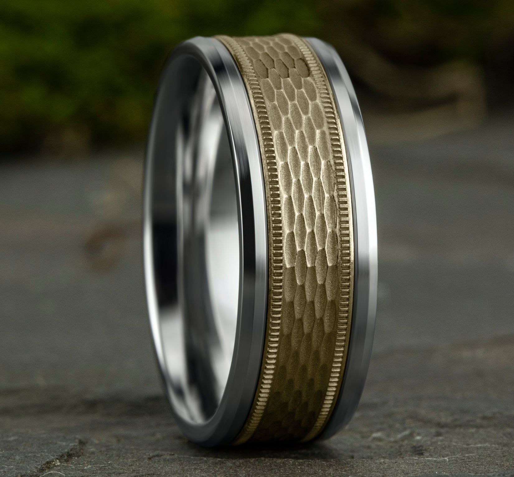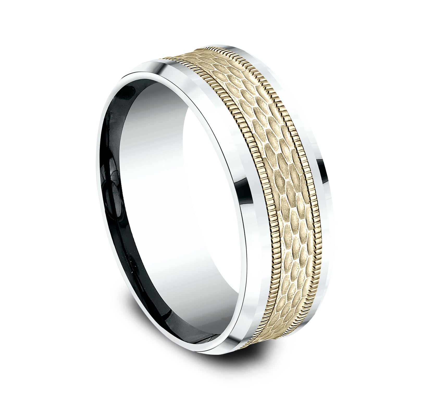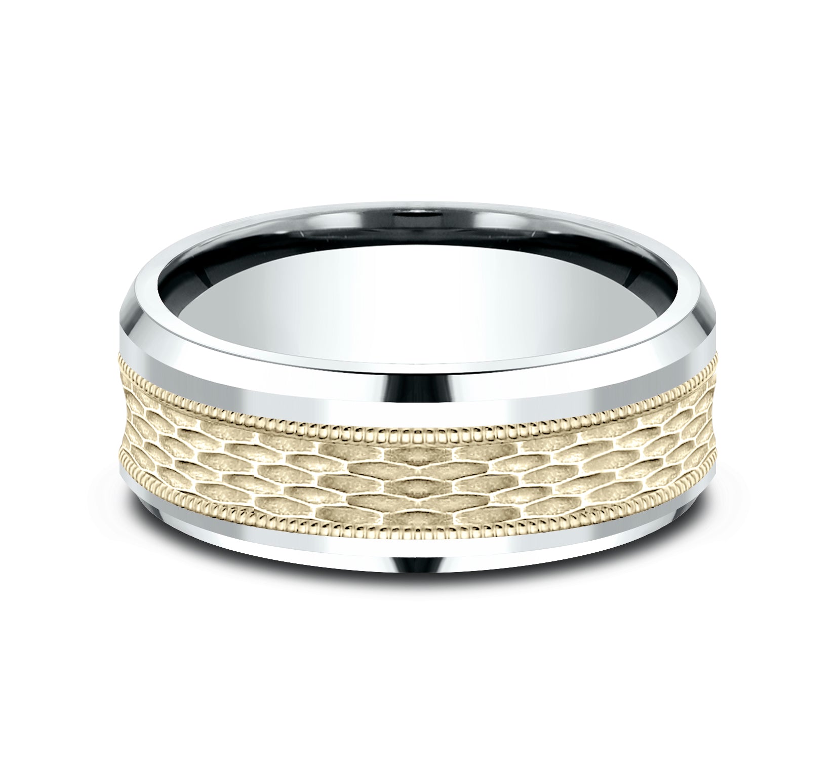8mm, Comfort fit 14K White and Yellow Gold Mesh pattern with milgrain detail, polished bevel edges