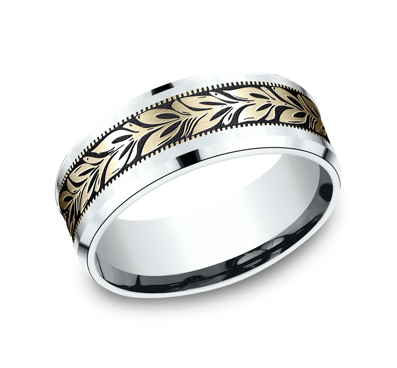 8mm, Comfort fit 14K White and Yellow Gold Leaf motif with wear resistant black detailing, polished bevel edges