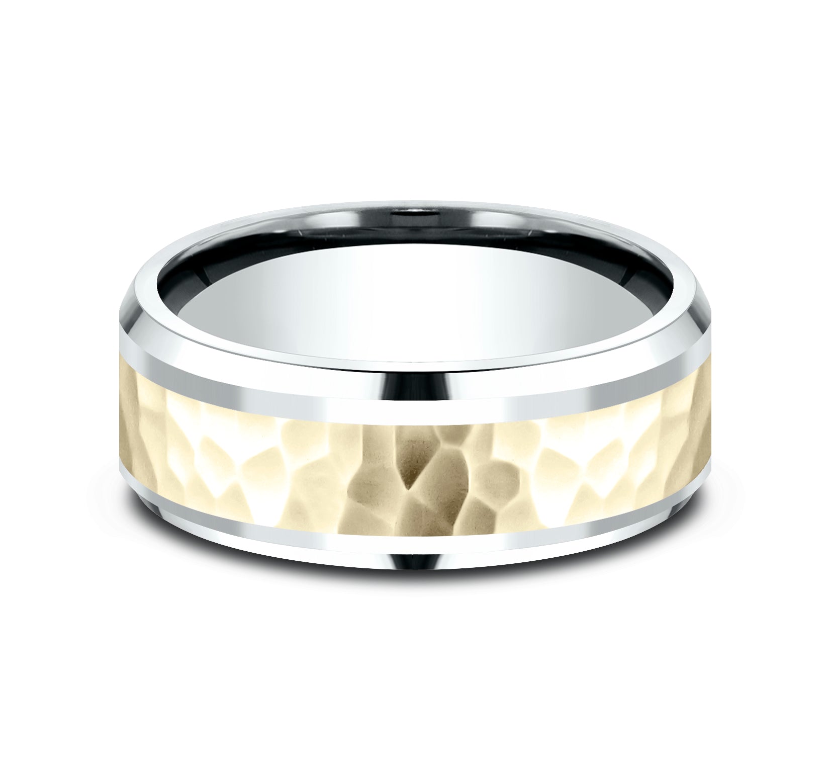 8mm, Comfort fit 14K White and Yellow Gold Hammered center, polished bevel edges