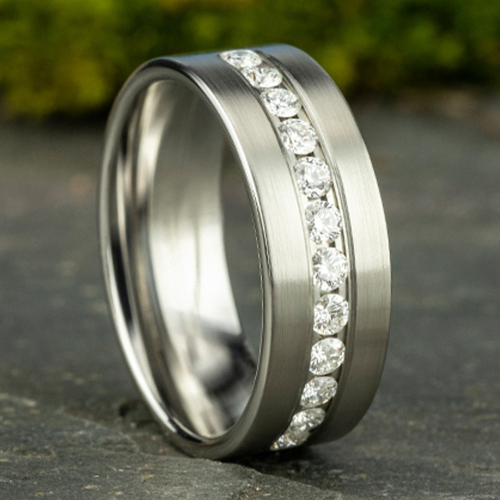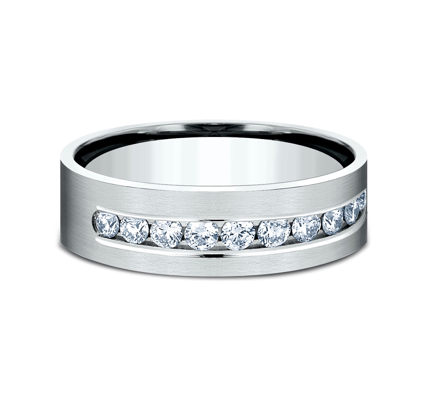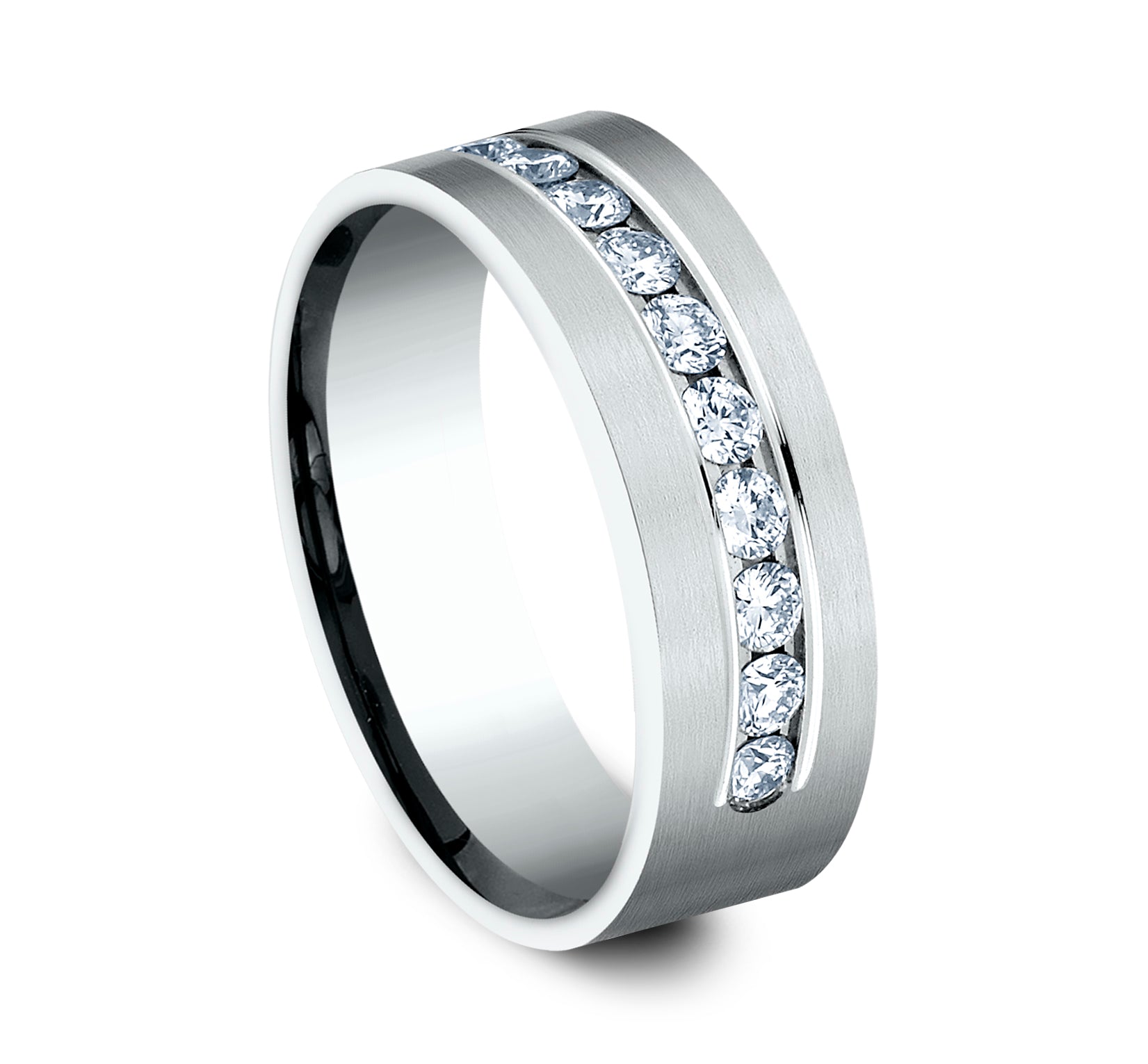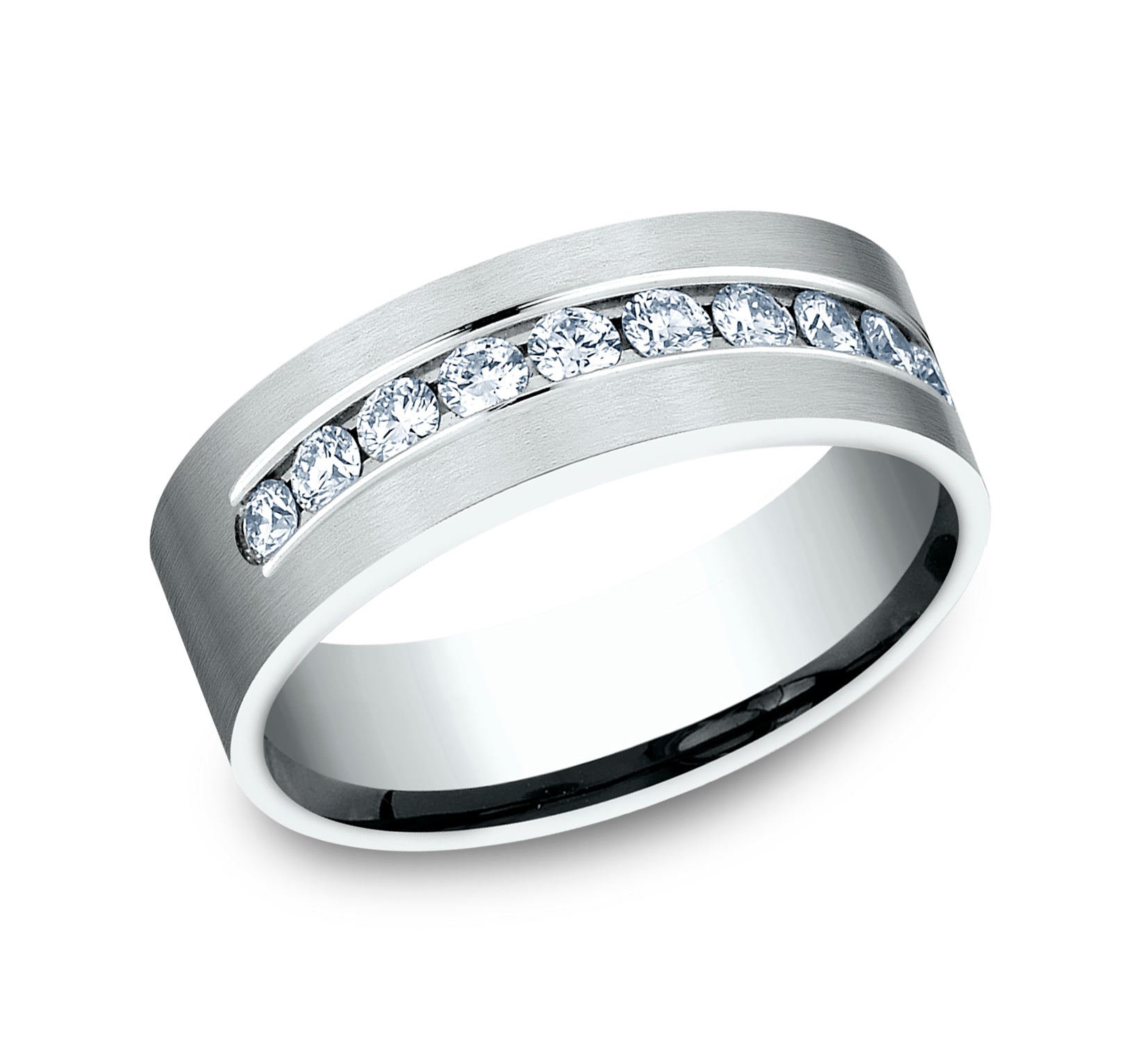 8mm, Comfort fit 14K White Gold Satin finish 12 channel set diamonds Carat weight is .72ct Clarity SI1-2, Color GH