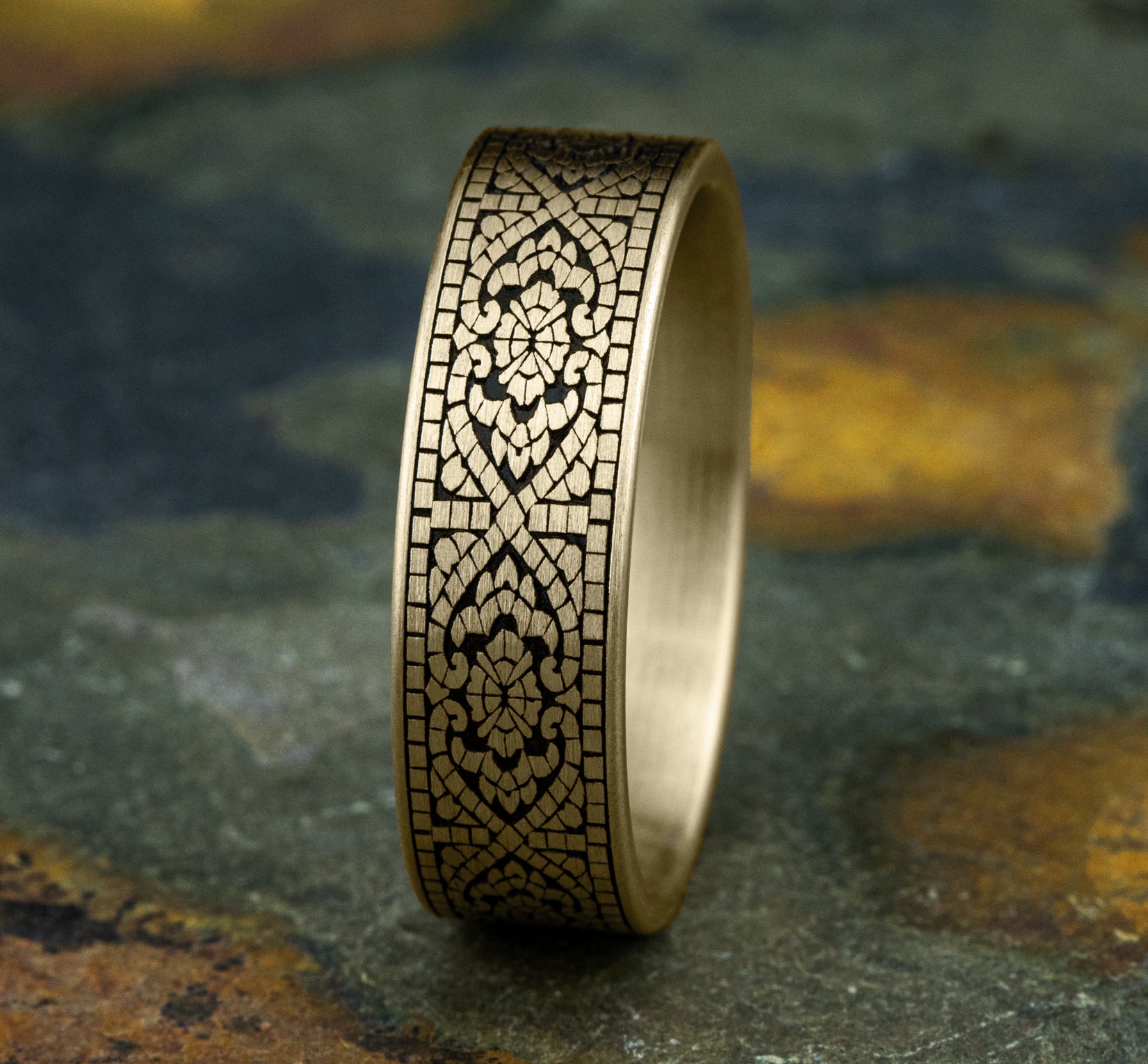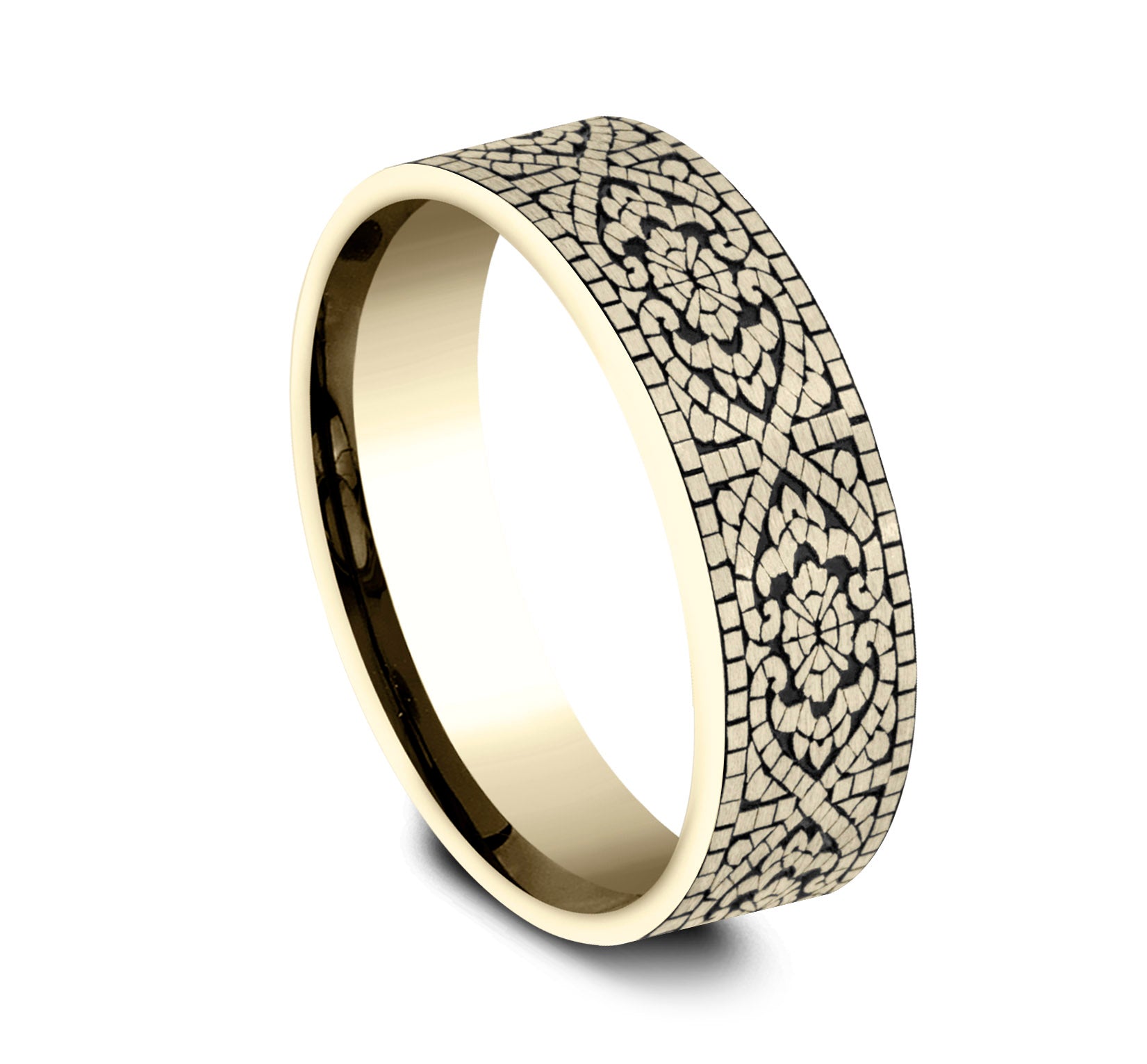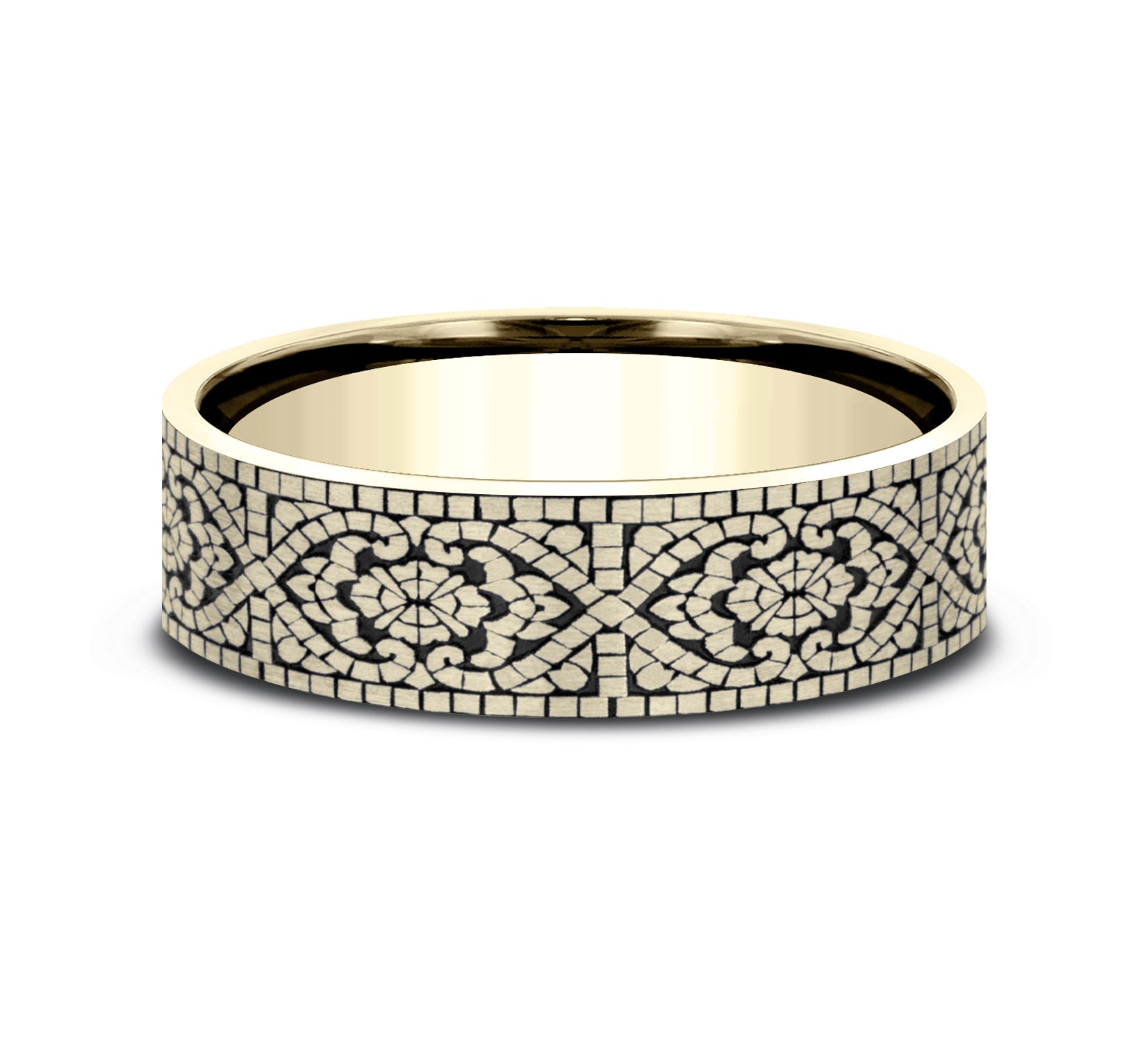 7mm, Comfort fit 14K Yellow Gold Mosaic pattern