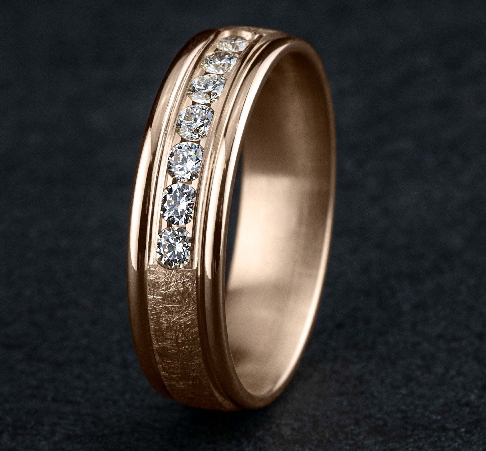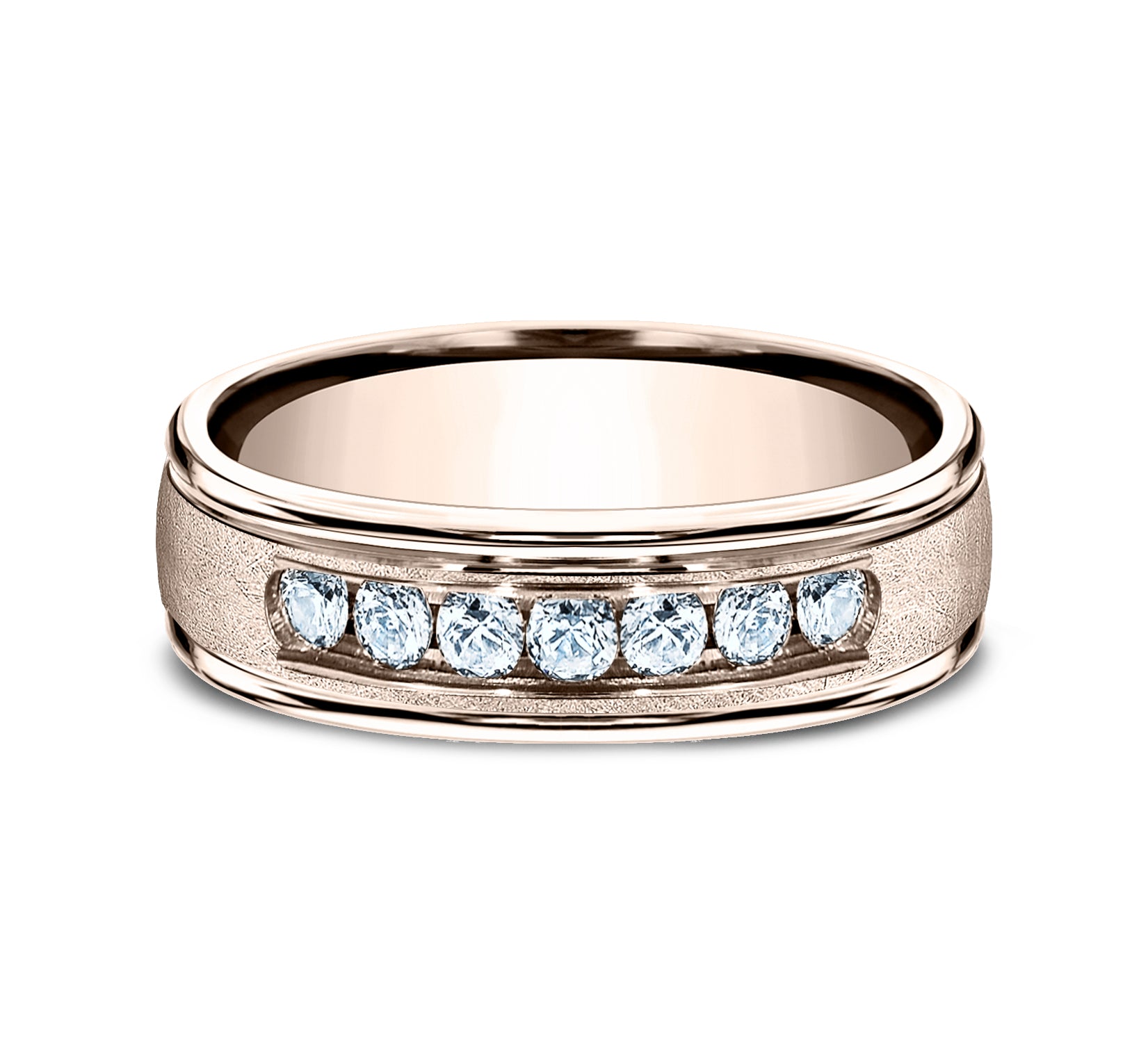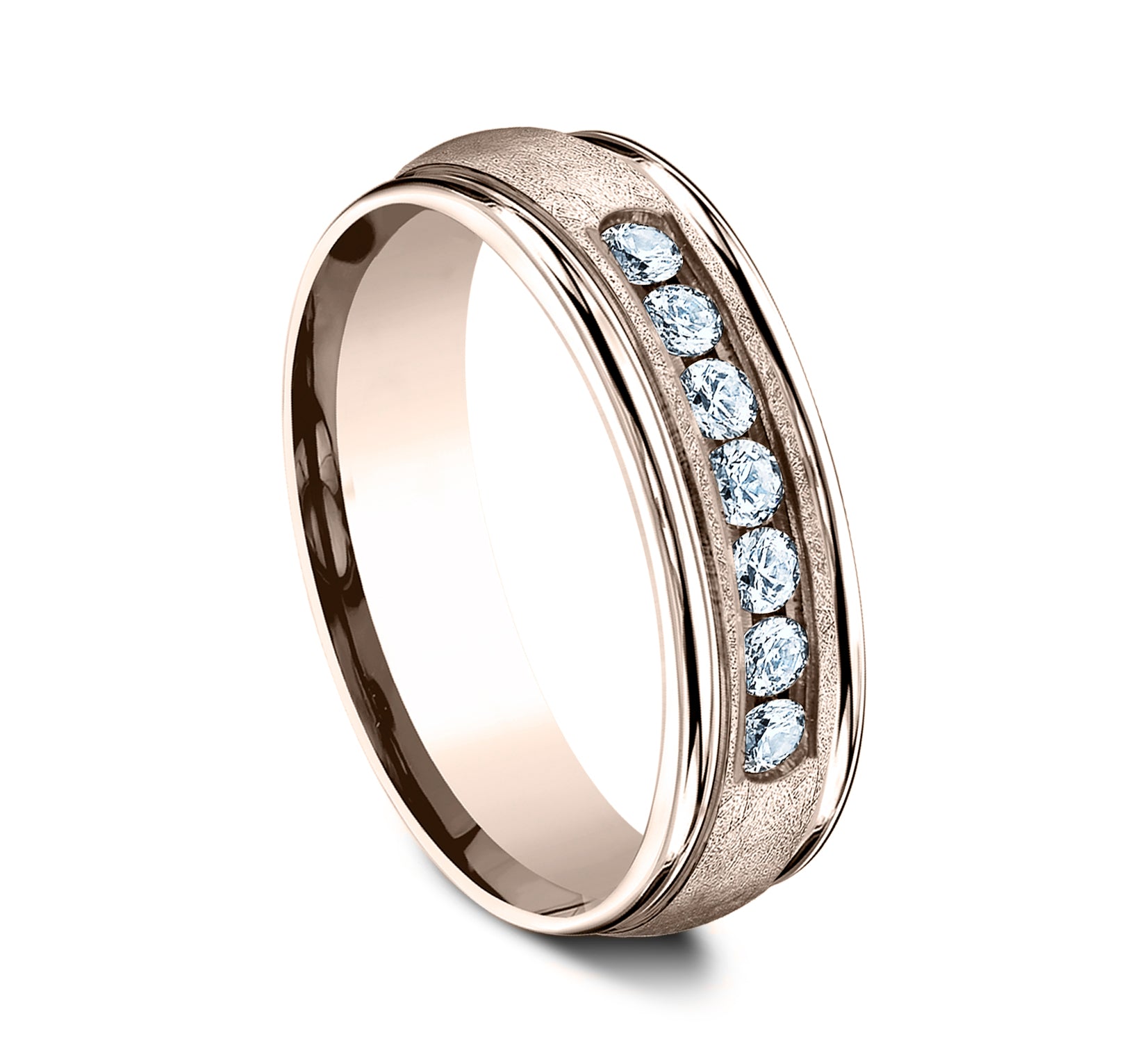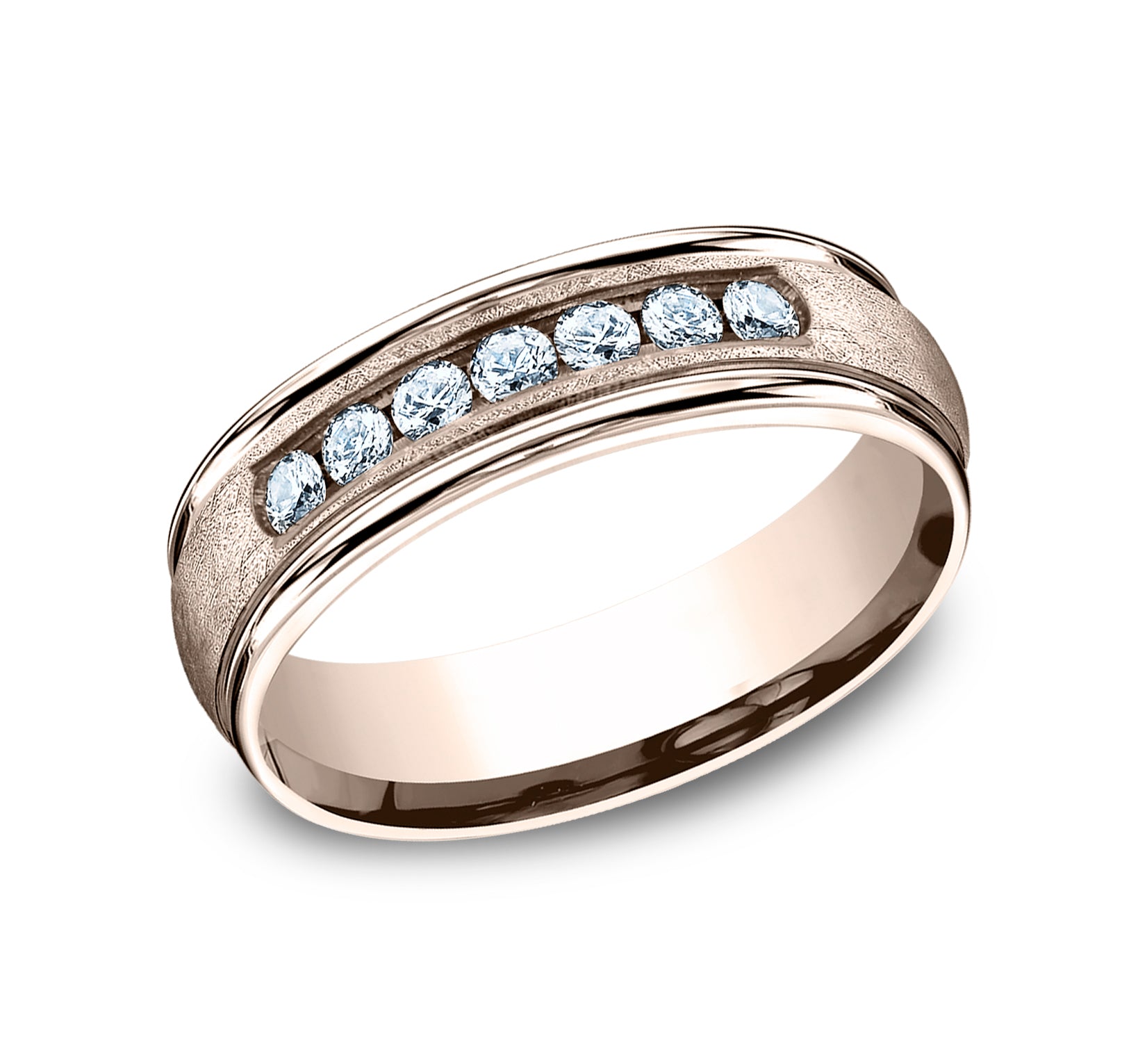 6.5mm, Comfort fit 14K Rose Gold Swirl finish, polished round edges 7 channel set diamonds Carat weight is .42ct Clarity SI1-2, Color GH