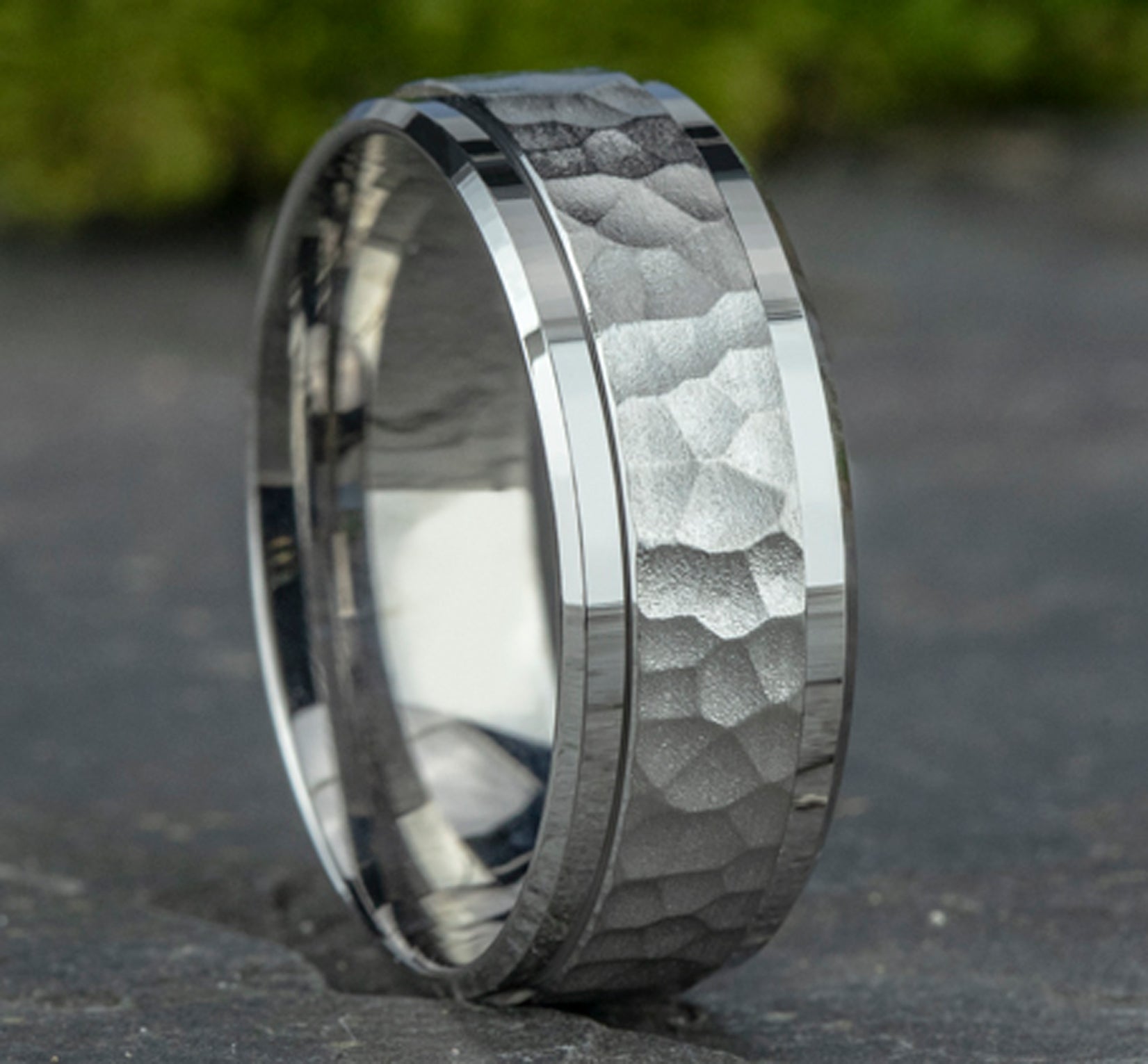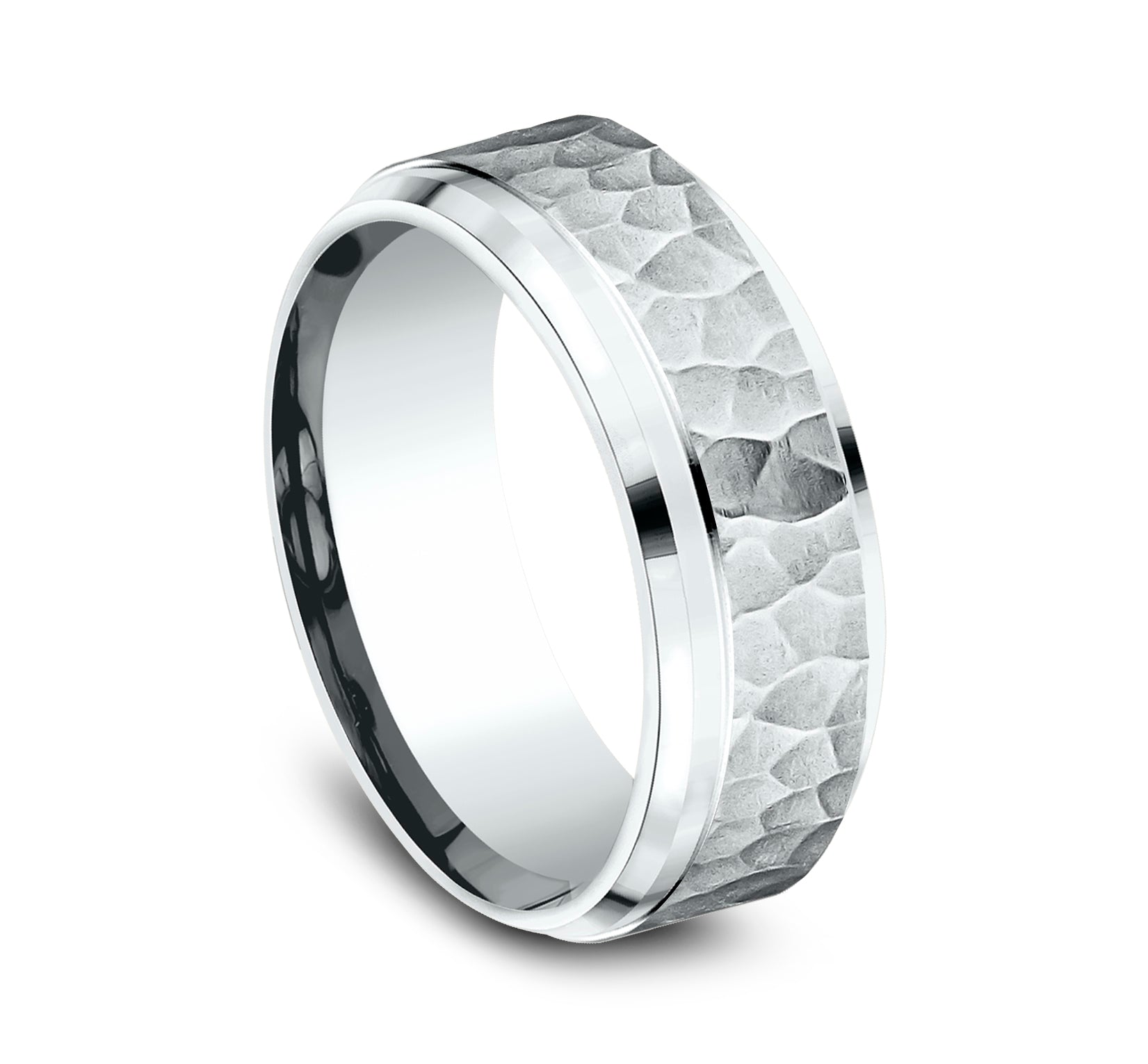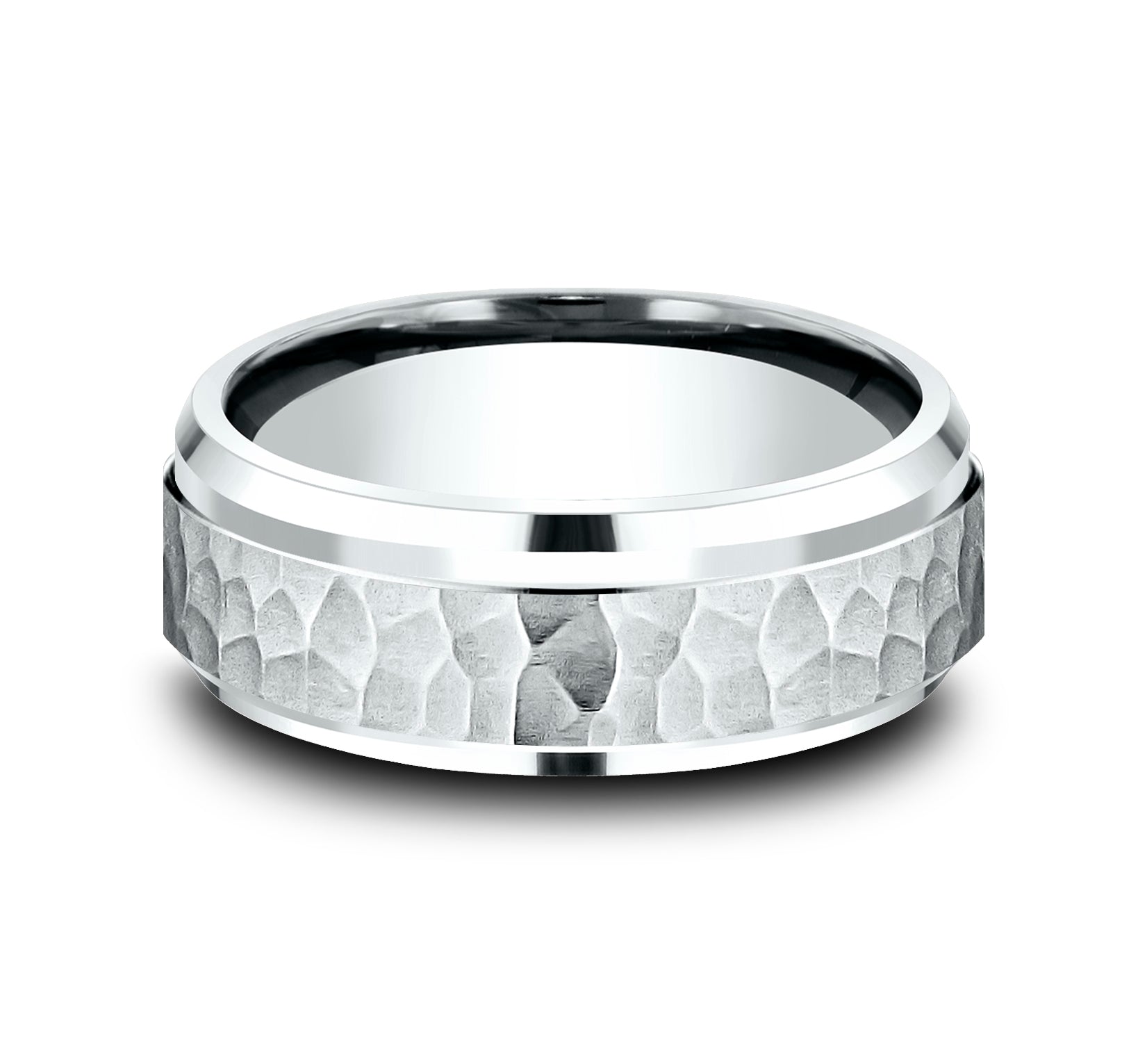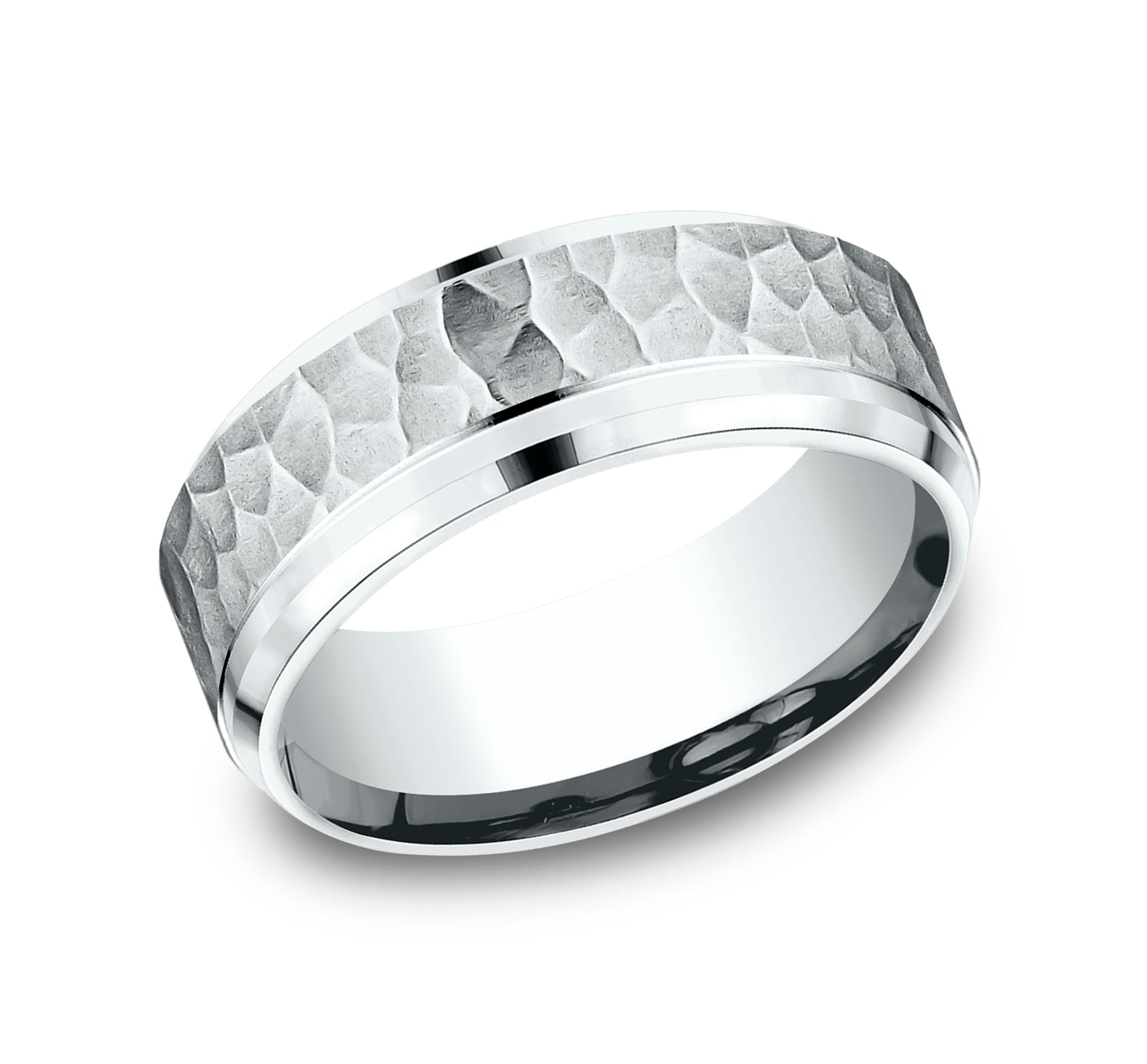 8mm, Comfort fit 14K White Gold Hammered center, polished bevel edges