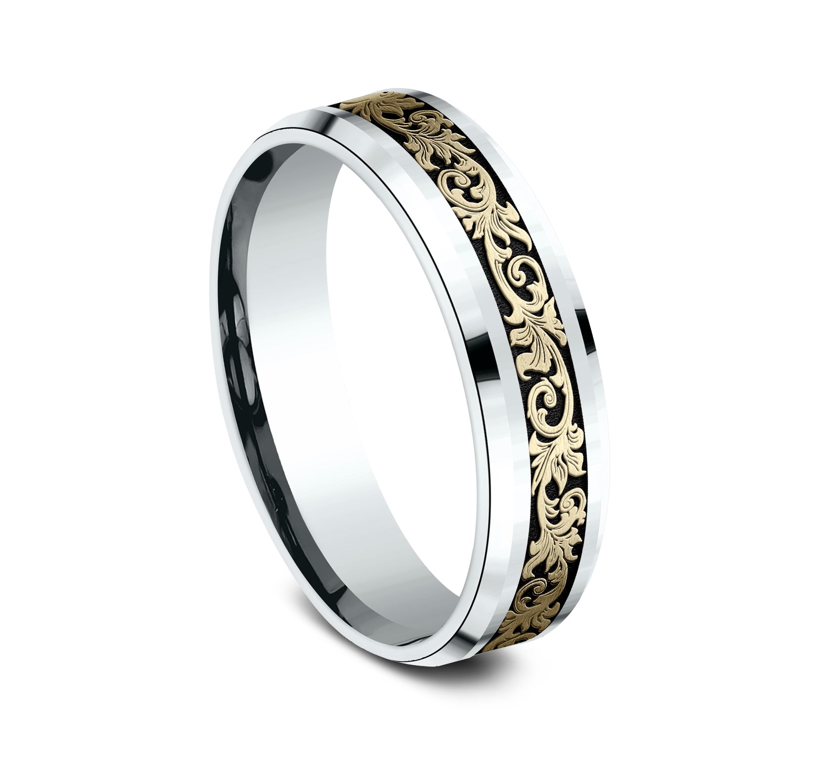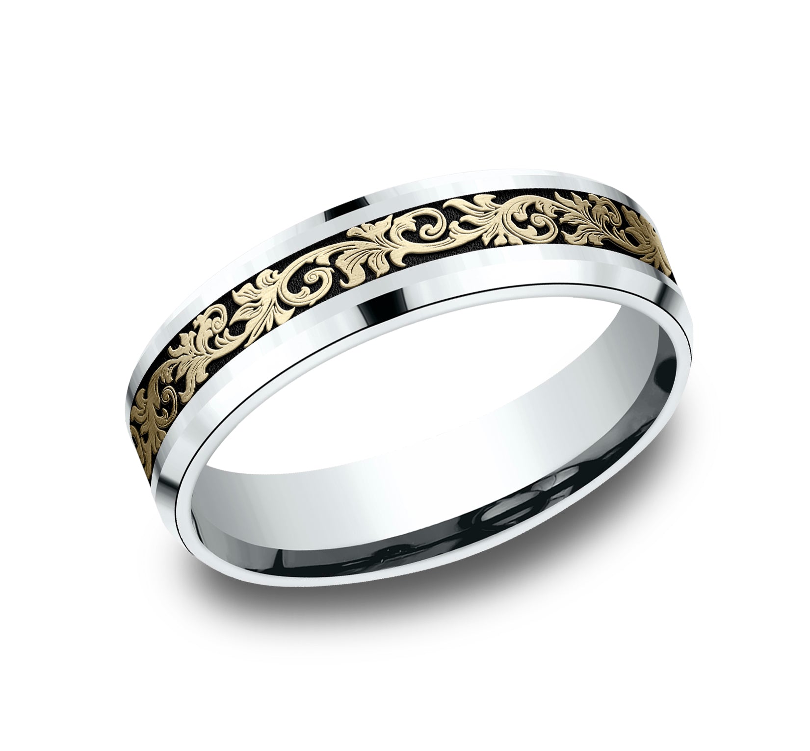 6mm, Comfort fit 14K White and Yellow Gold Vintage script pattern with wear resistant black detailing, polished bevel edges