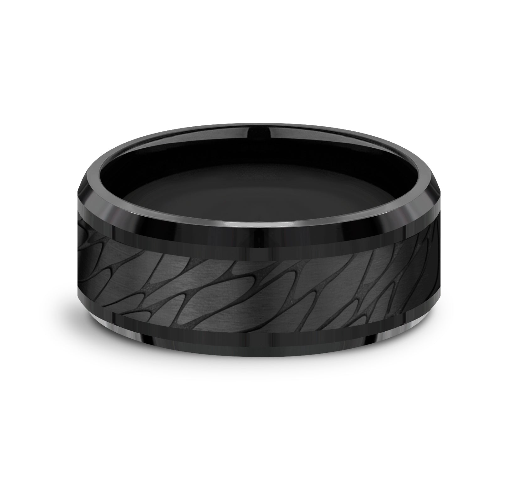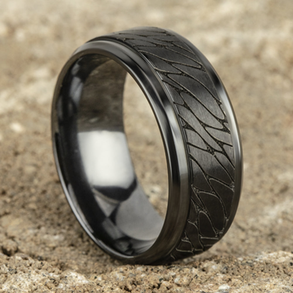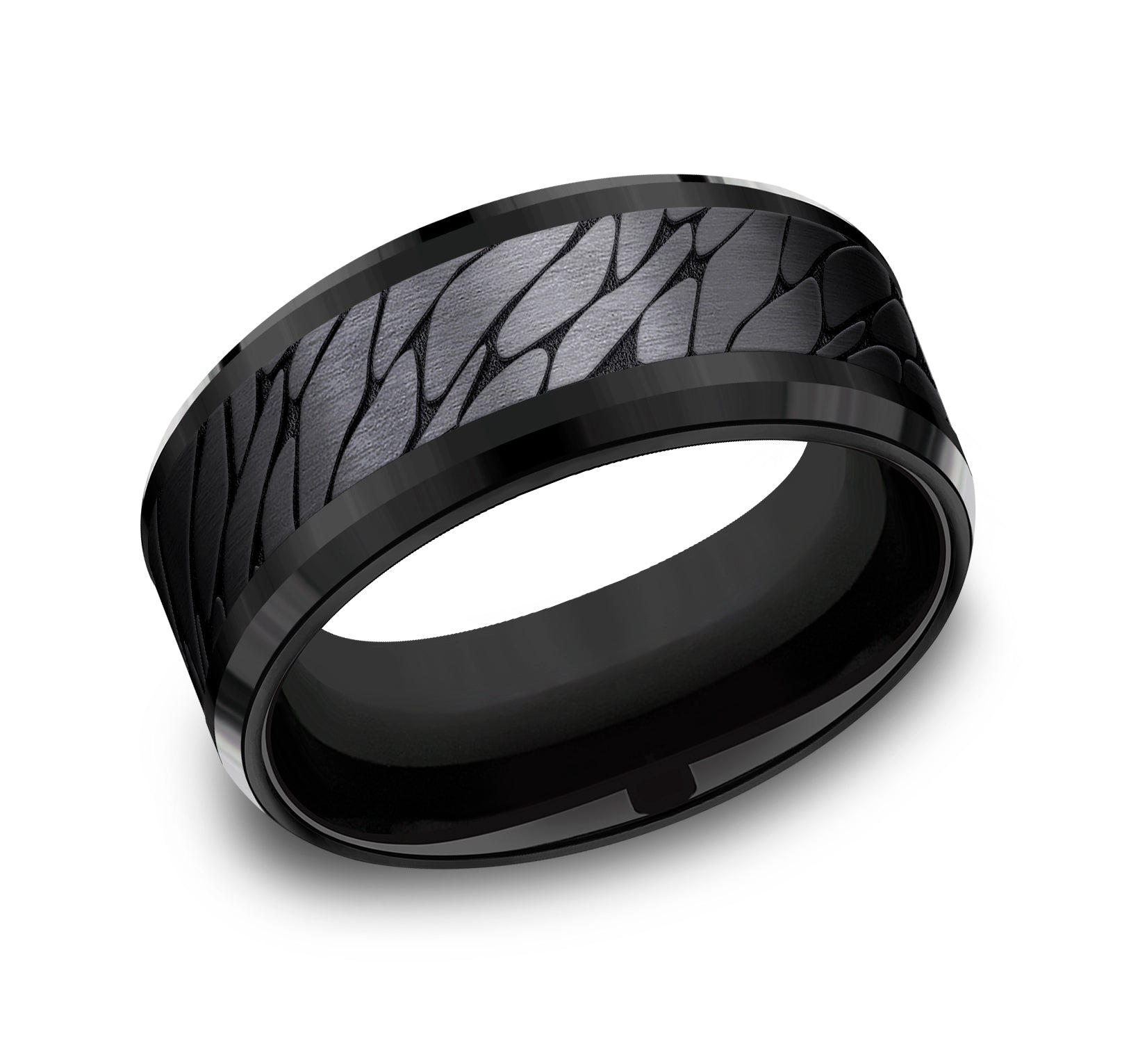 9mm, Comfort fit Black Titanium Pebble patterned center, bevel edges