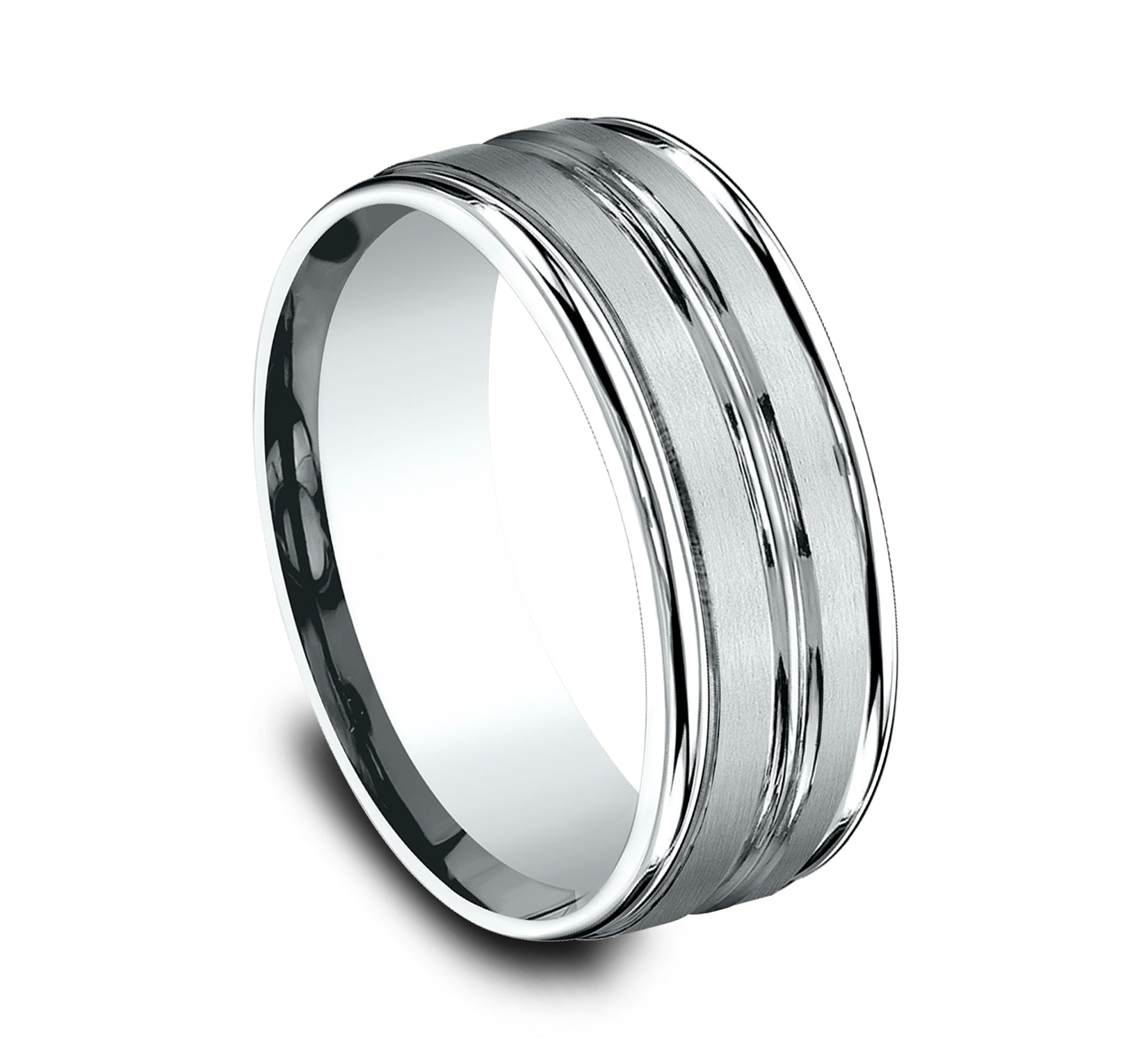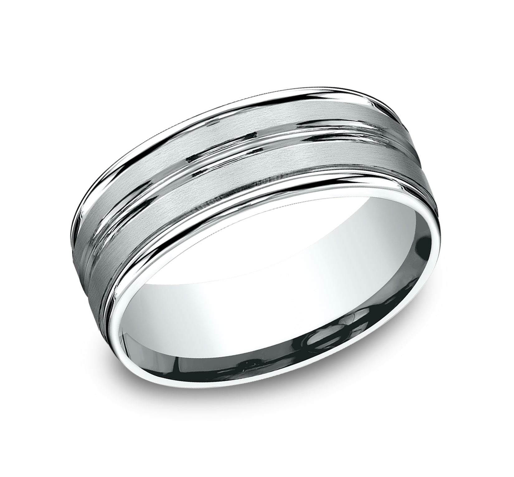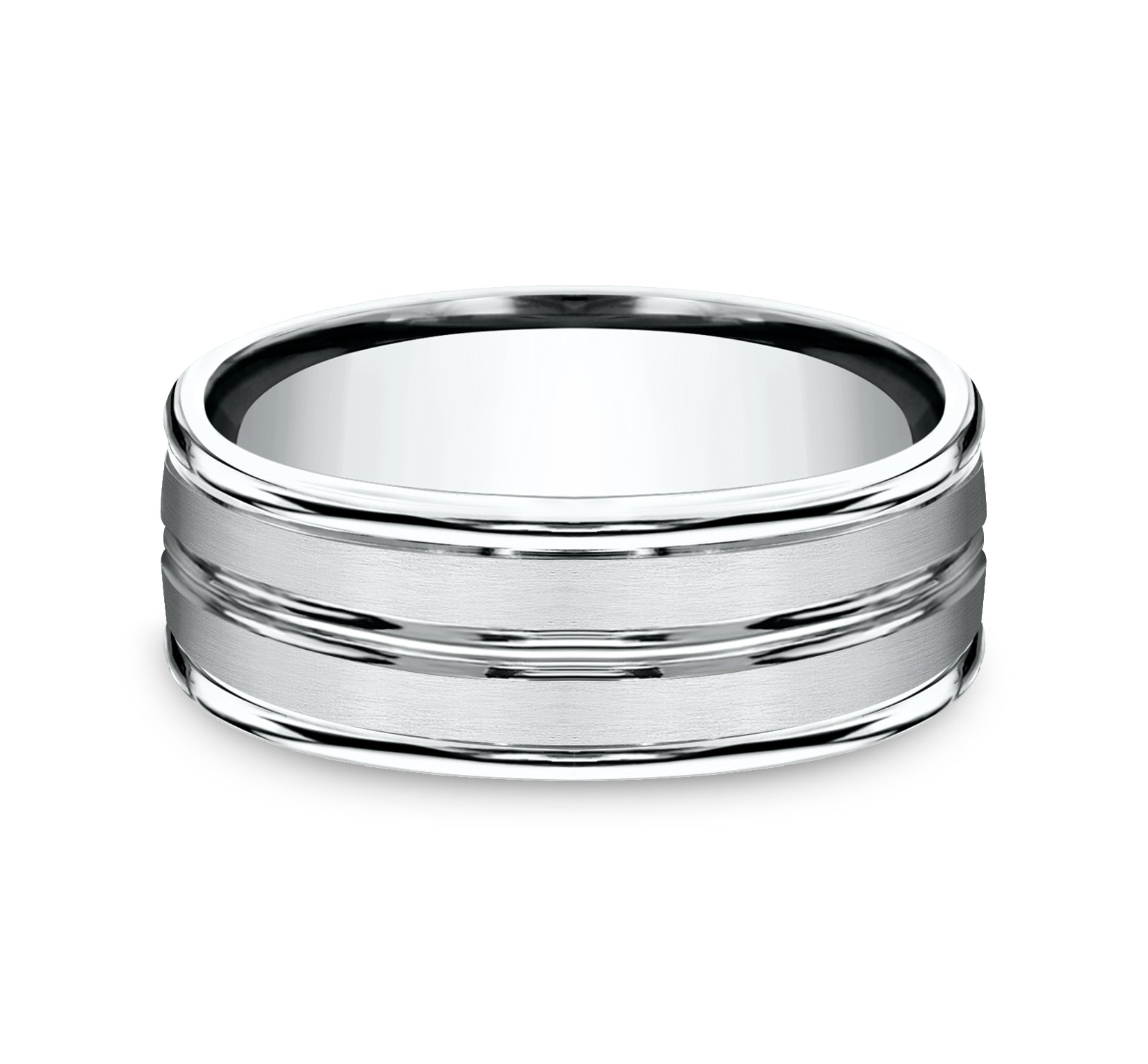 8mm, Comfort fit 14K White Gold Satin finish, polished double center cuts and round edges
