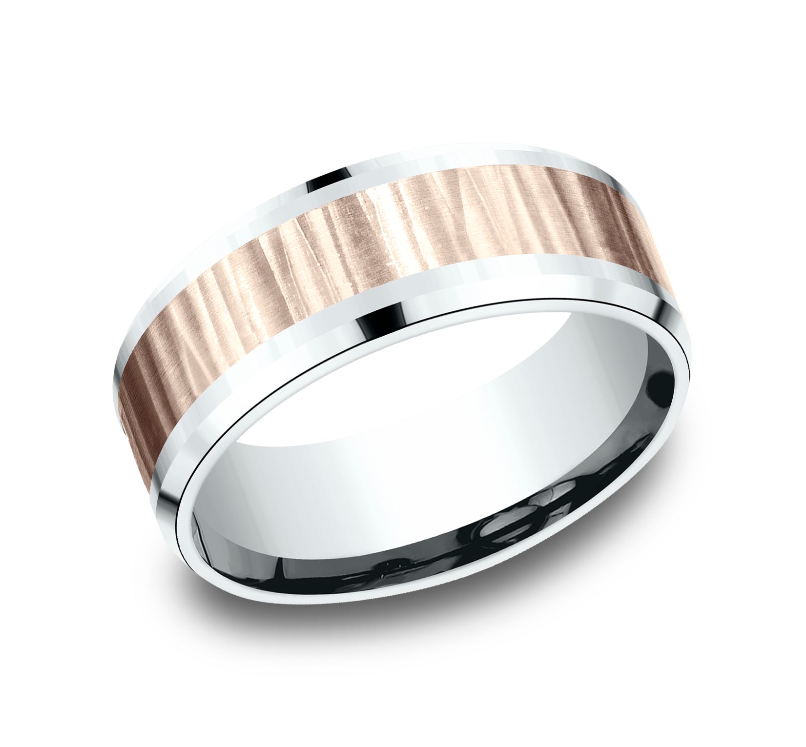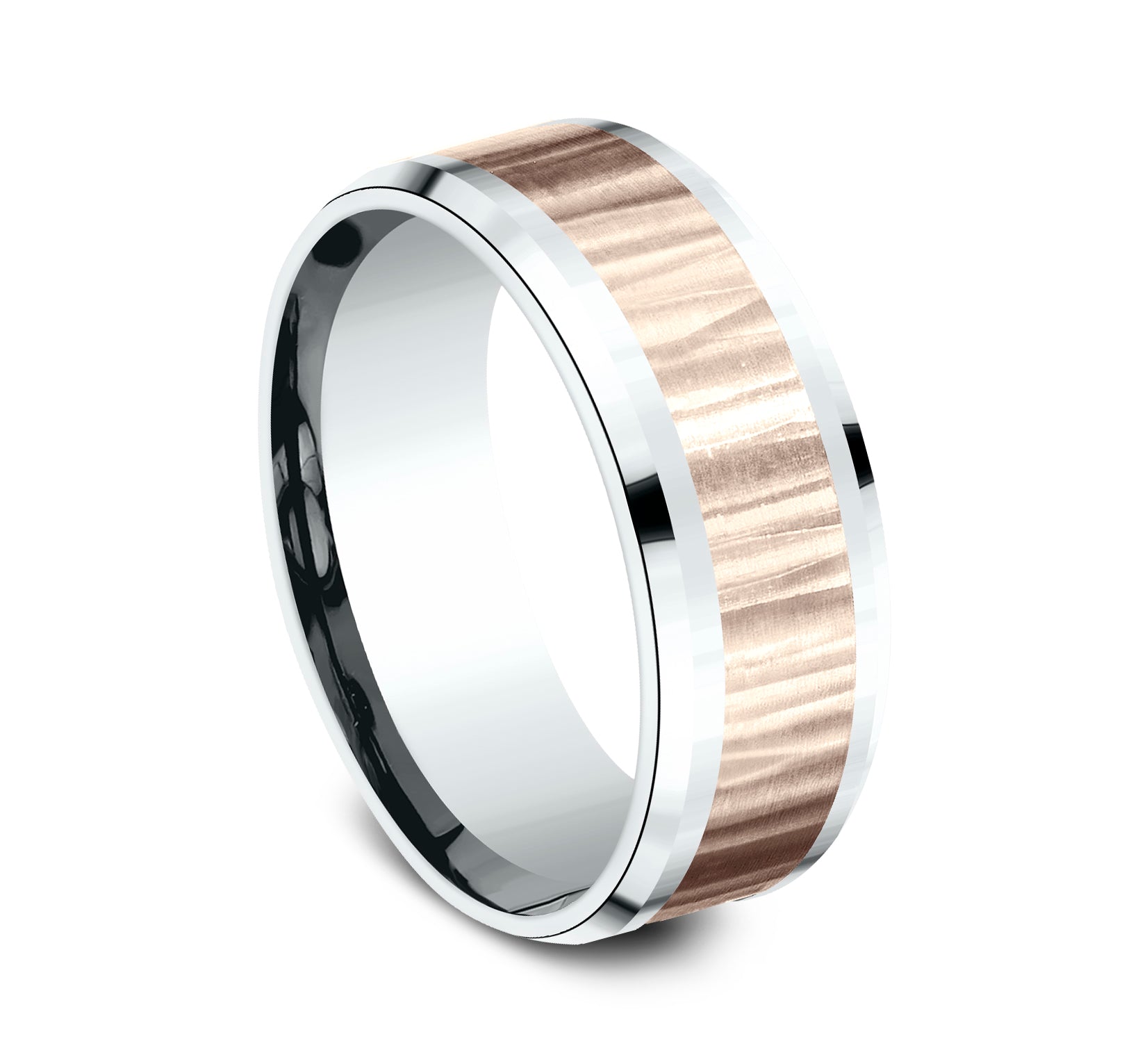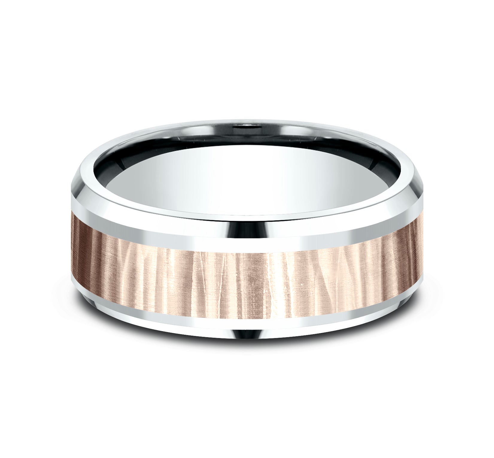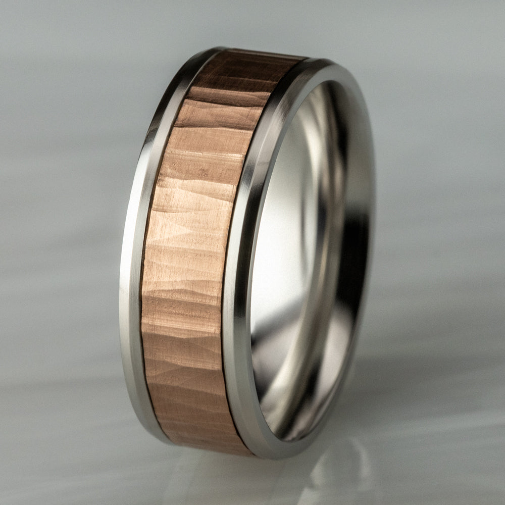 8mm, Comfort fit 14K White and Rose Gold Vertical hammered finish, polished bevel edges