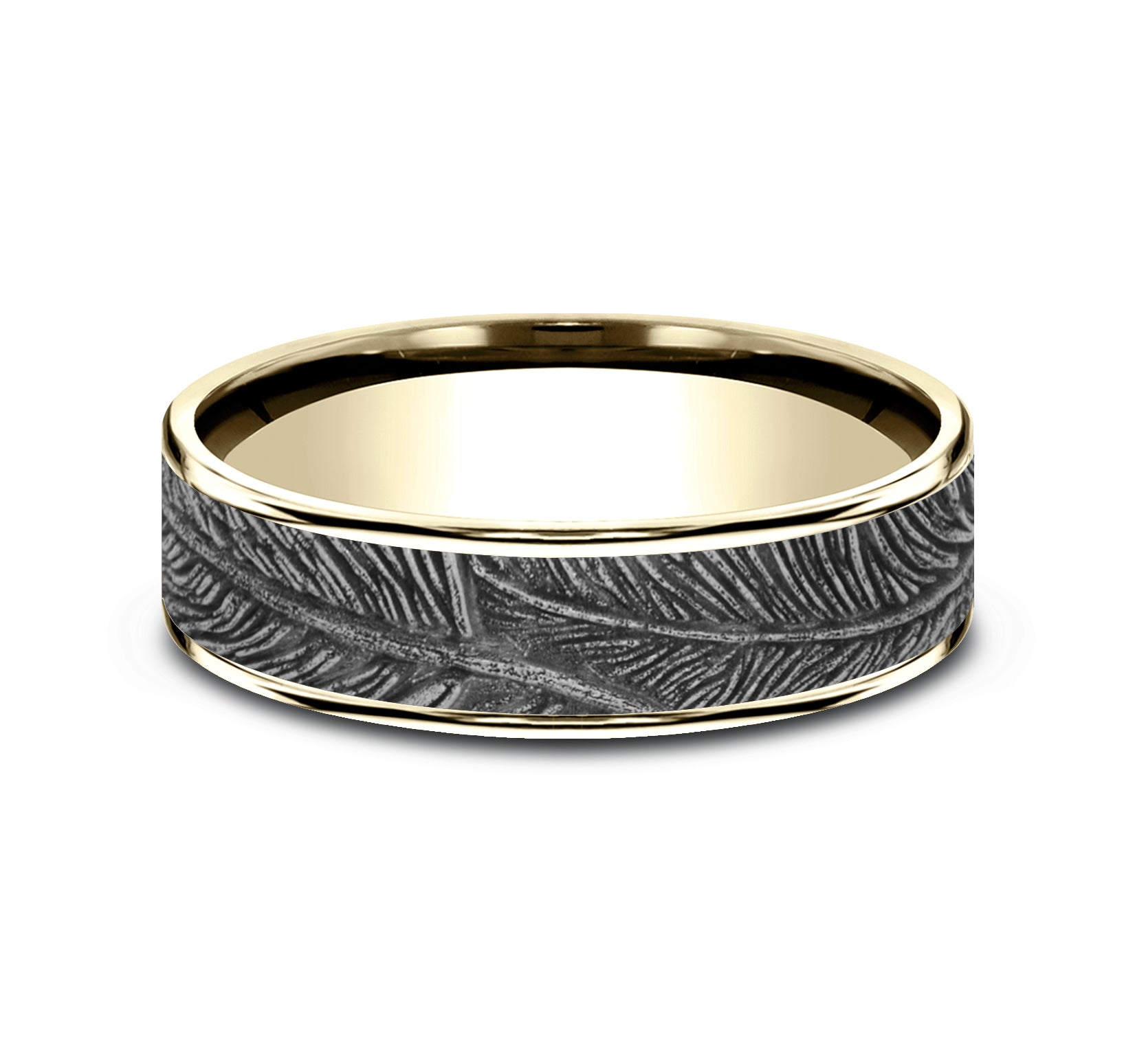 6.5mm, Comfort fit 14K Yellow and White Gold Feather pattern, thin edges