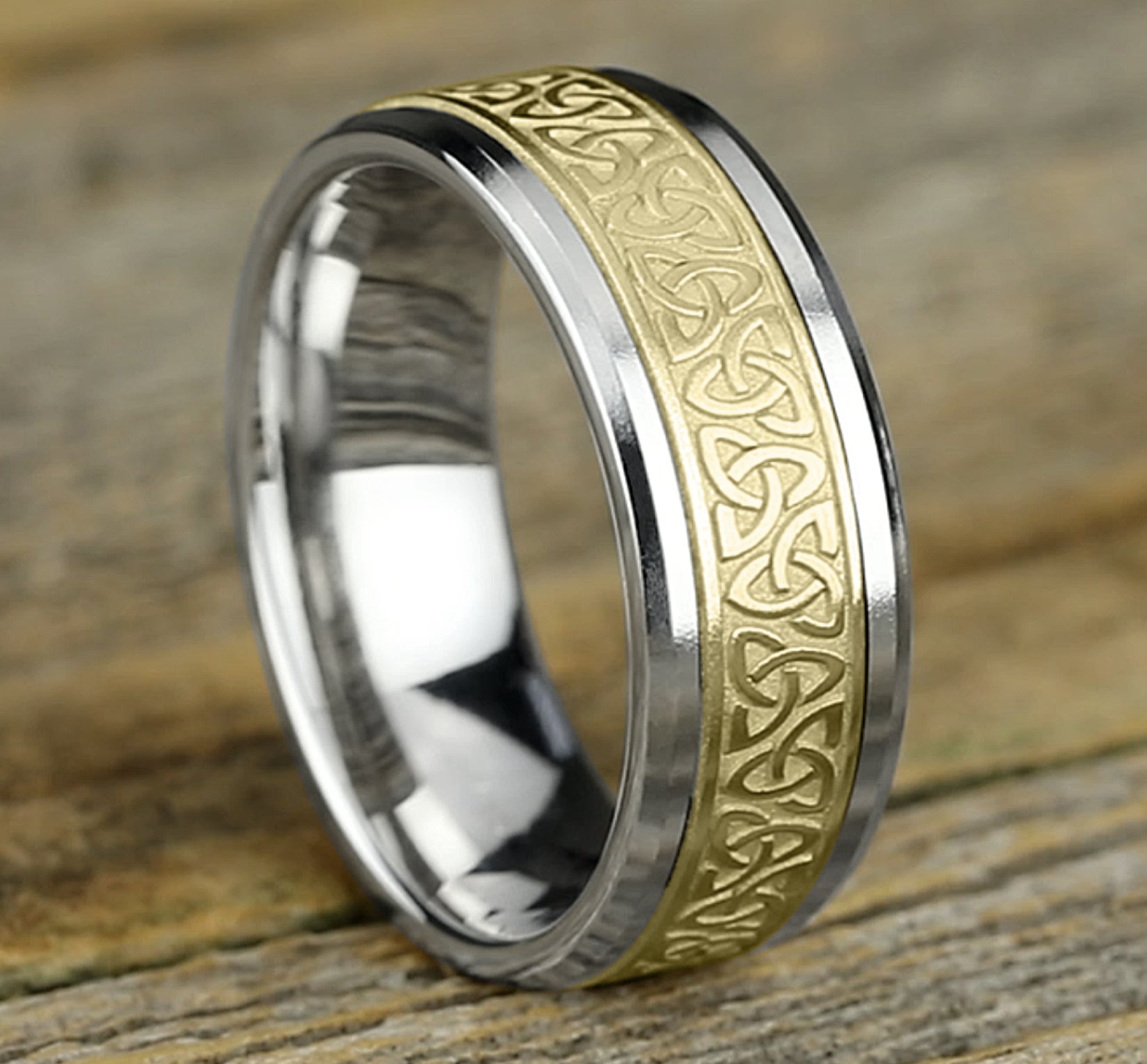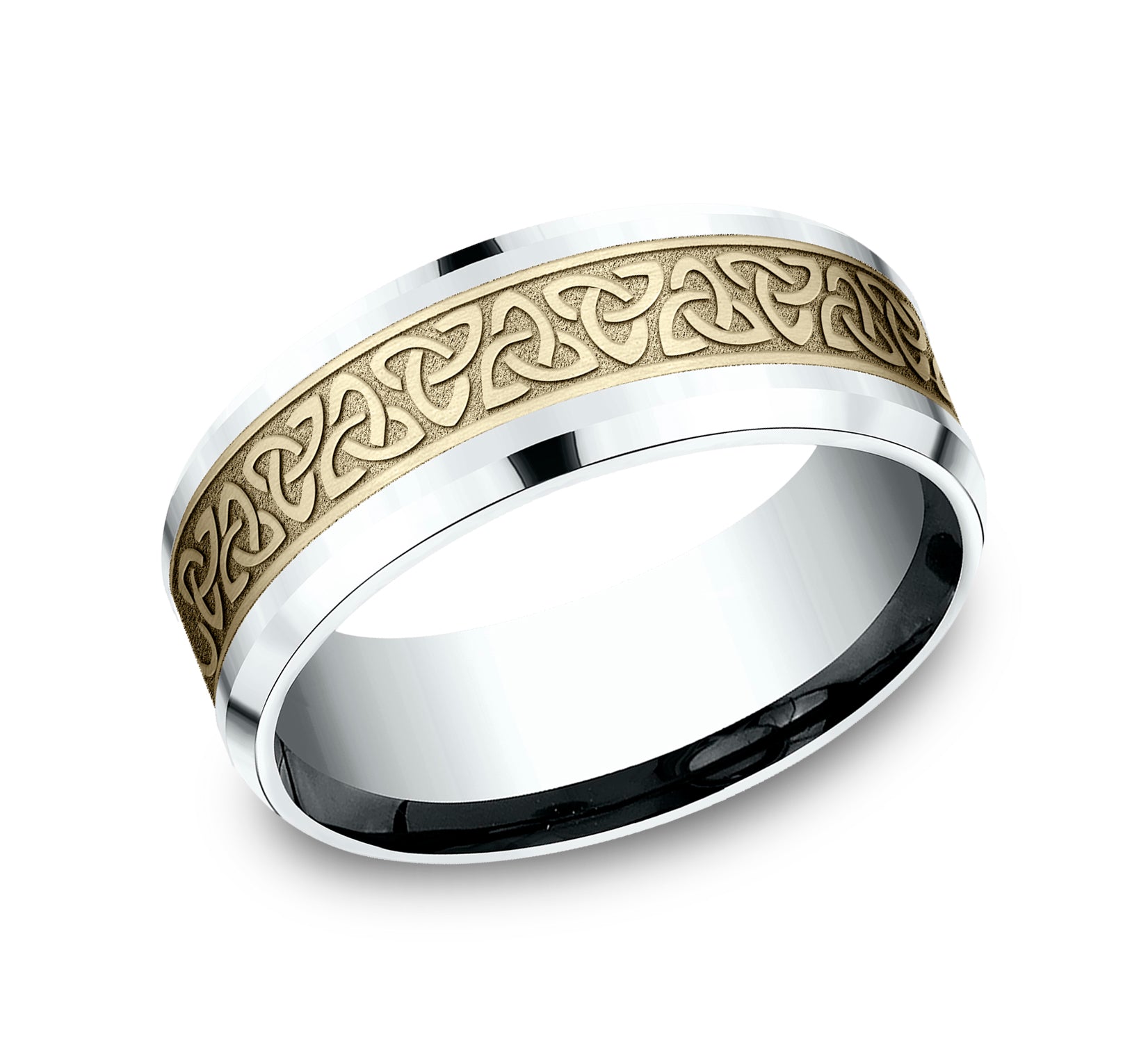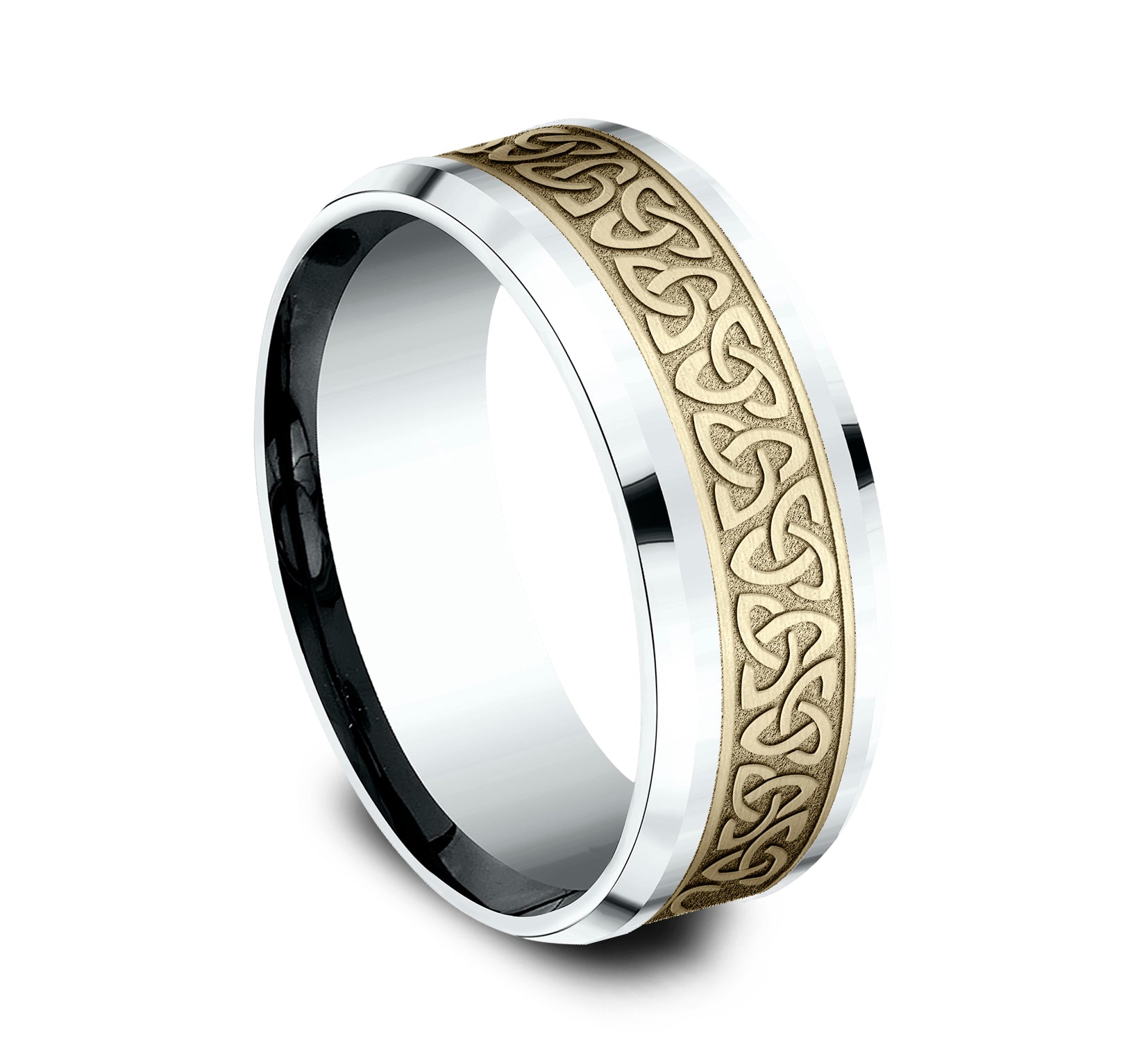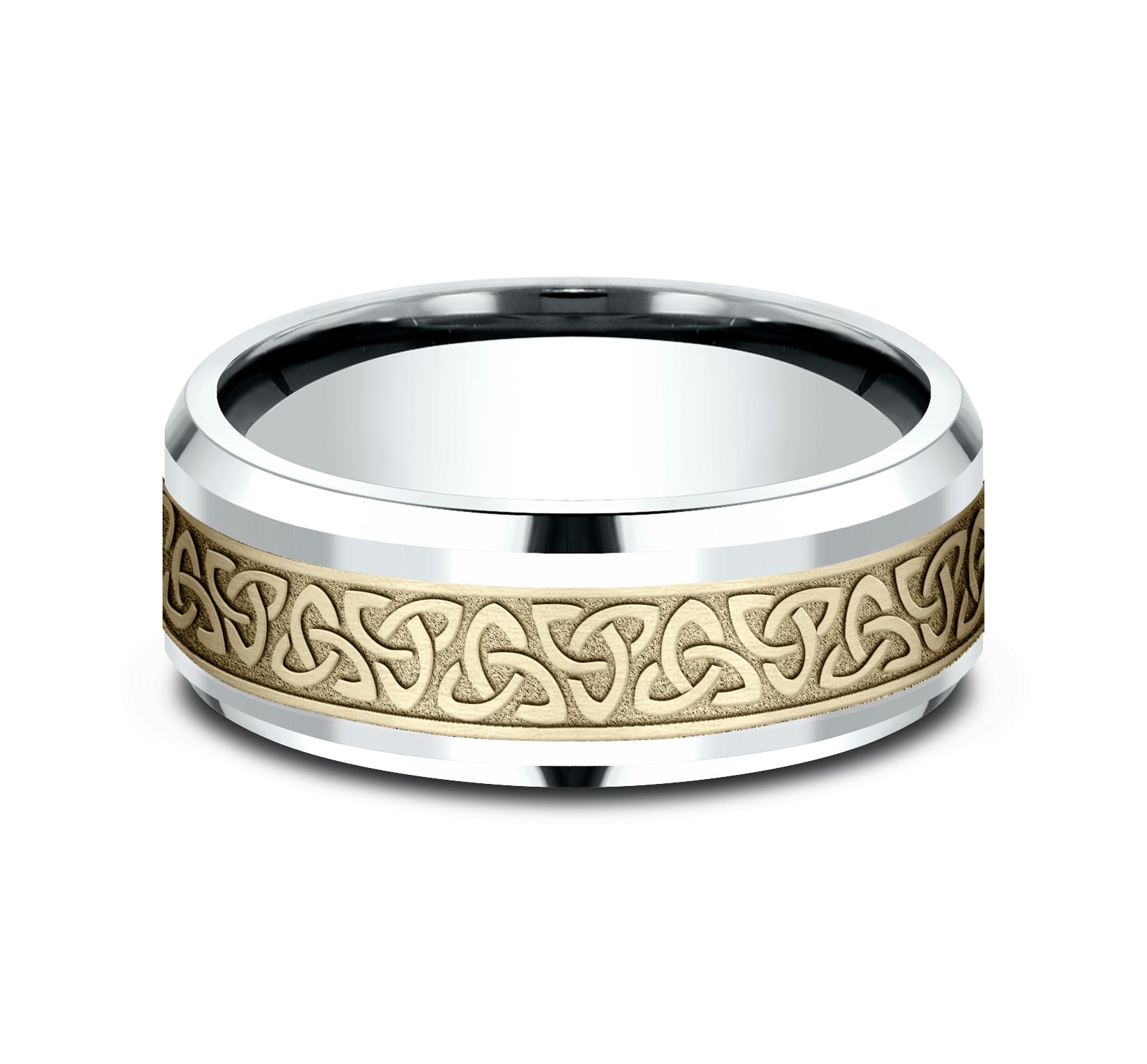 8mm, Comfort fit 14K White and Yellow Gold Celtic knot pattern, polished drop bevel edges