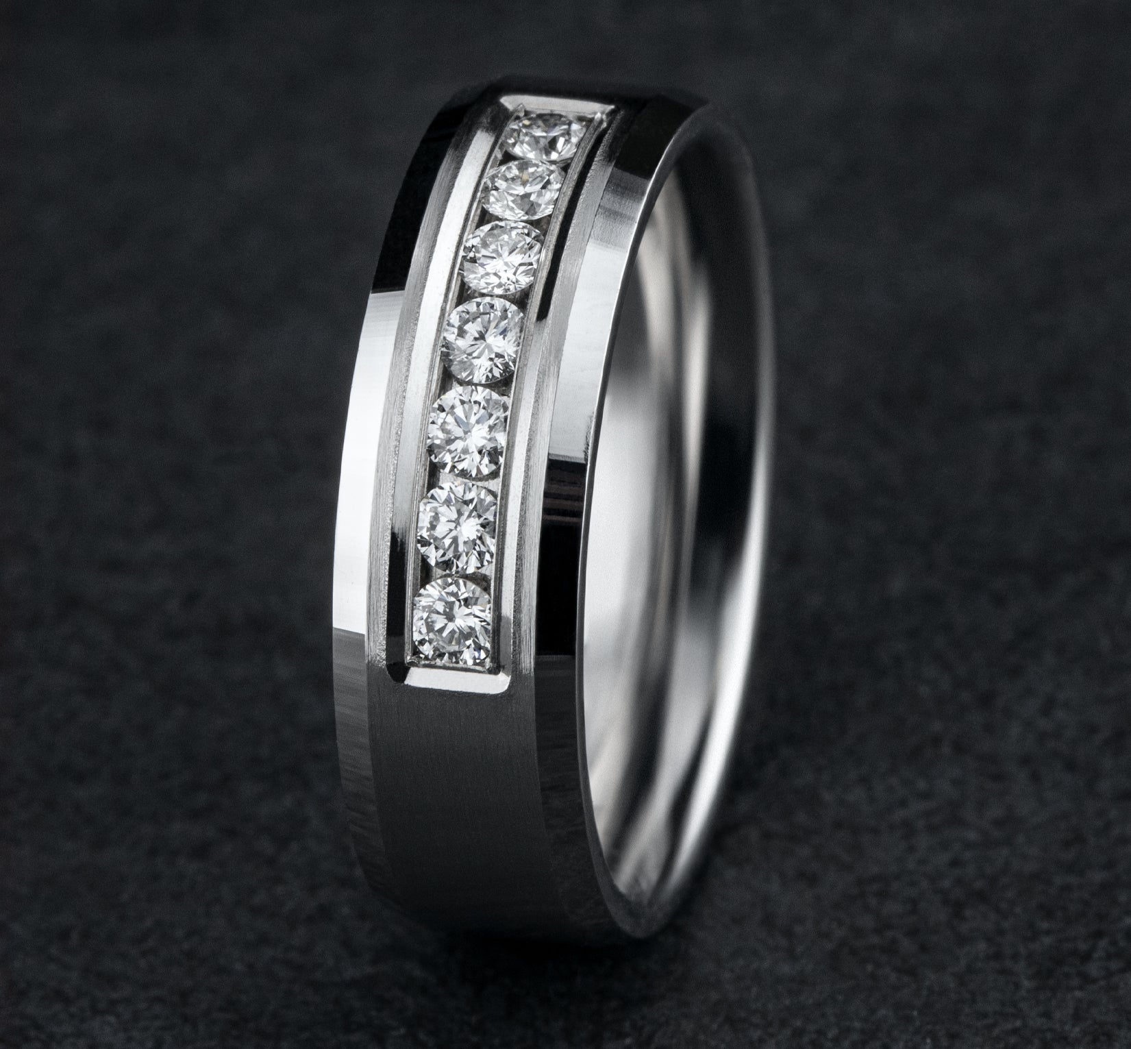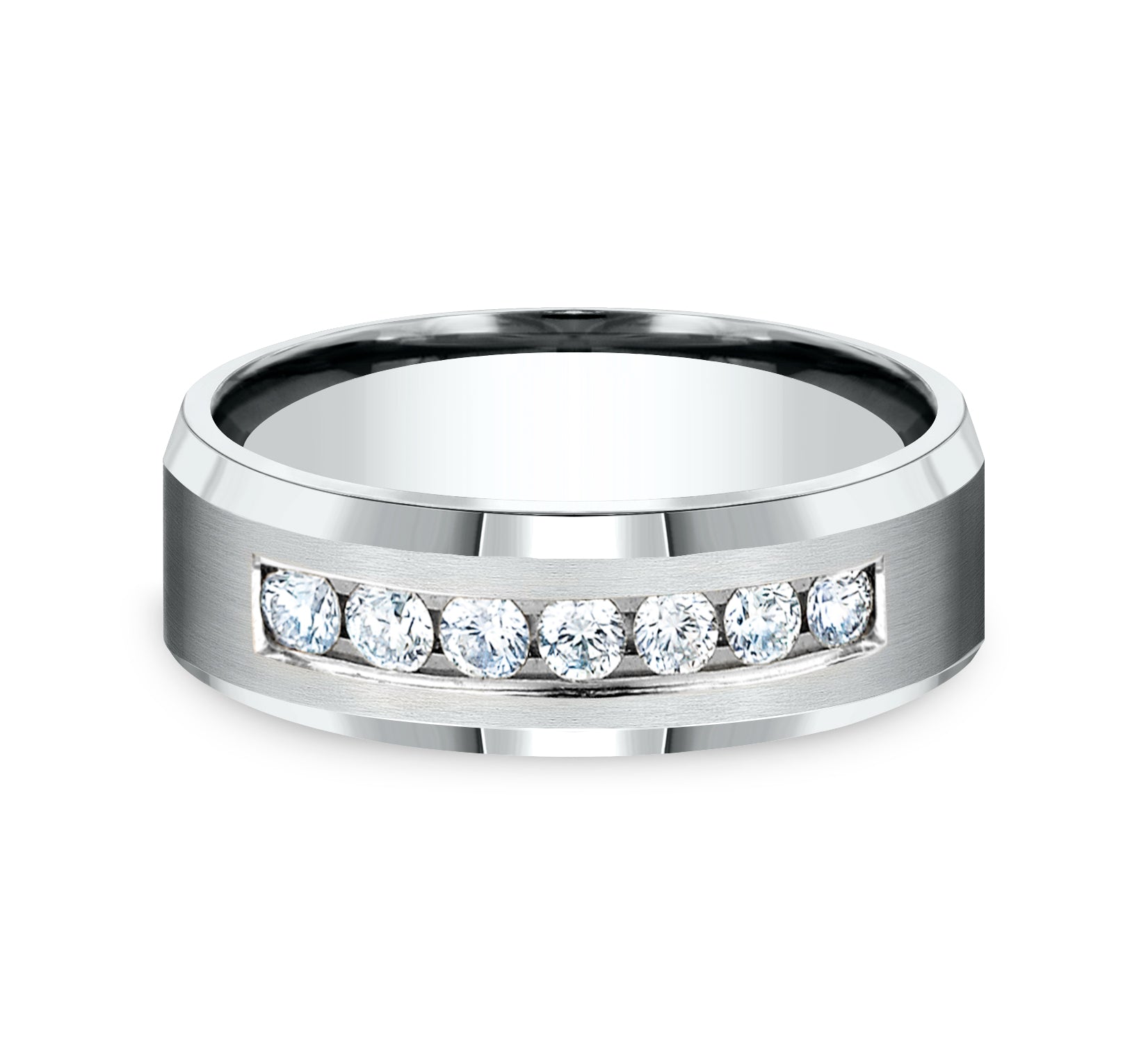 7mm, Comfort fit 14K White Gold Satin center, bevel edges 7 channel set diamonds Carat weight is .42ct Clarity SI1-2, Color GH