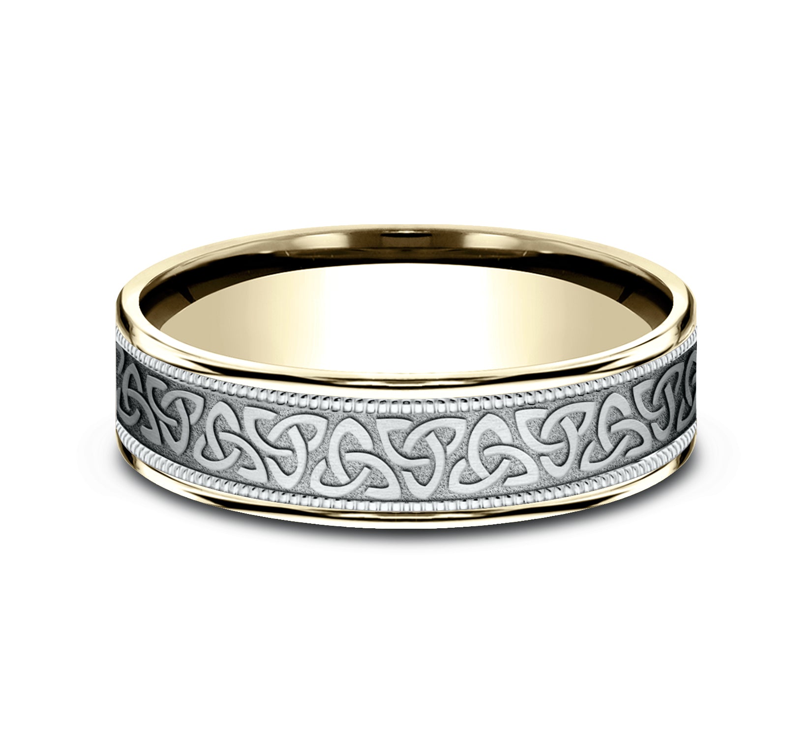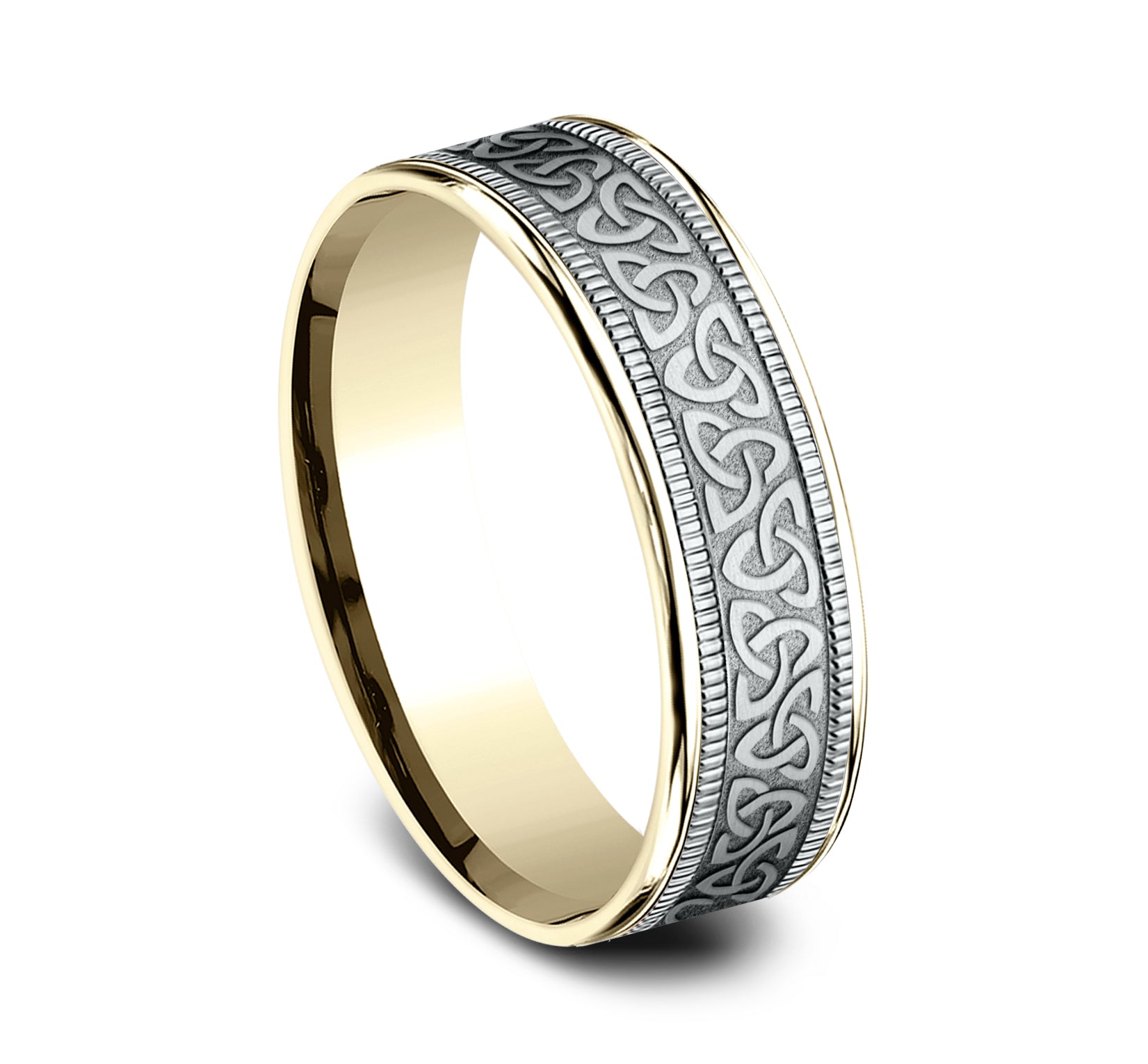 6.5mm, Comfort fit 14K Yellow and White Gold Celtic knot pattern with milgrain detail, thin edges