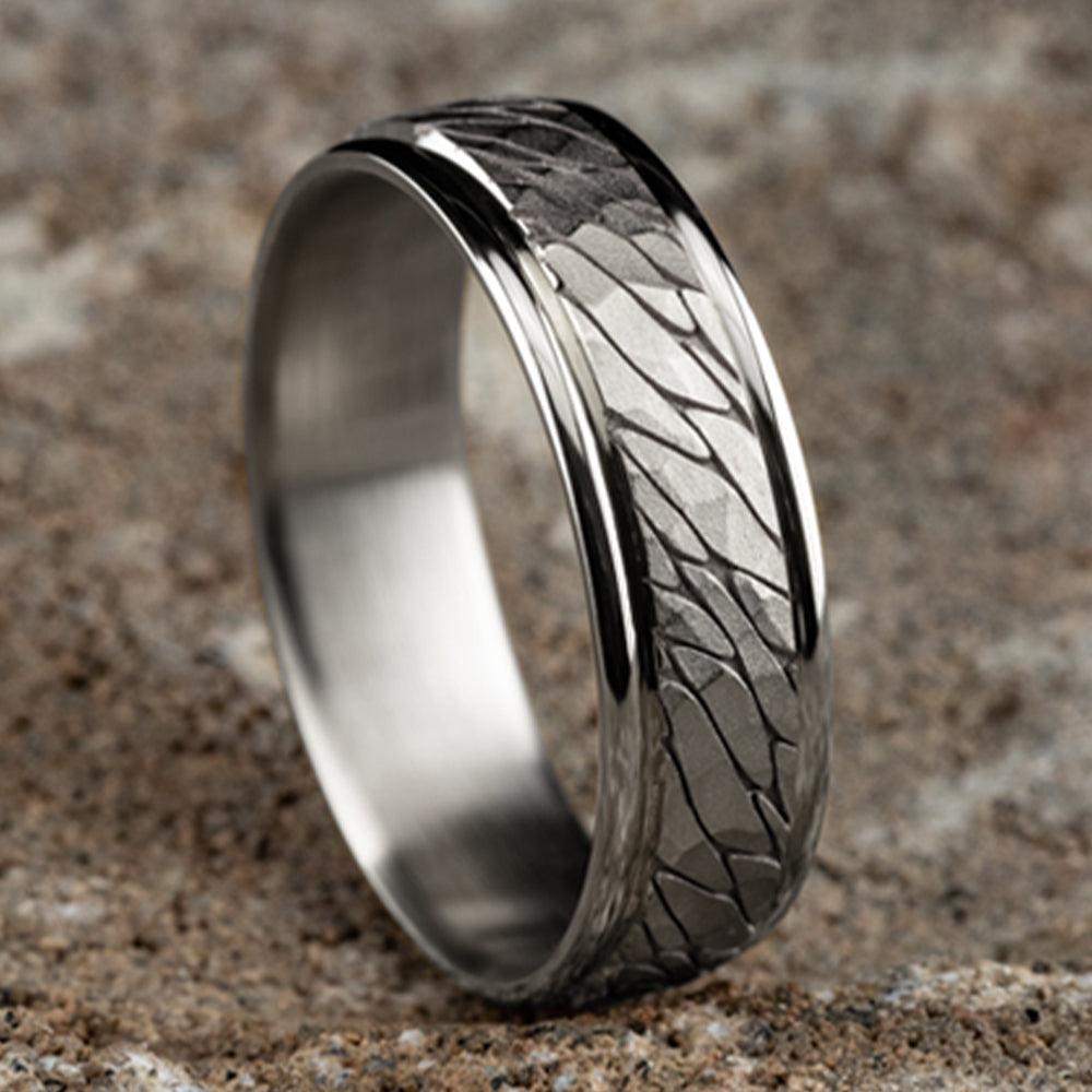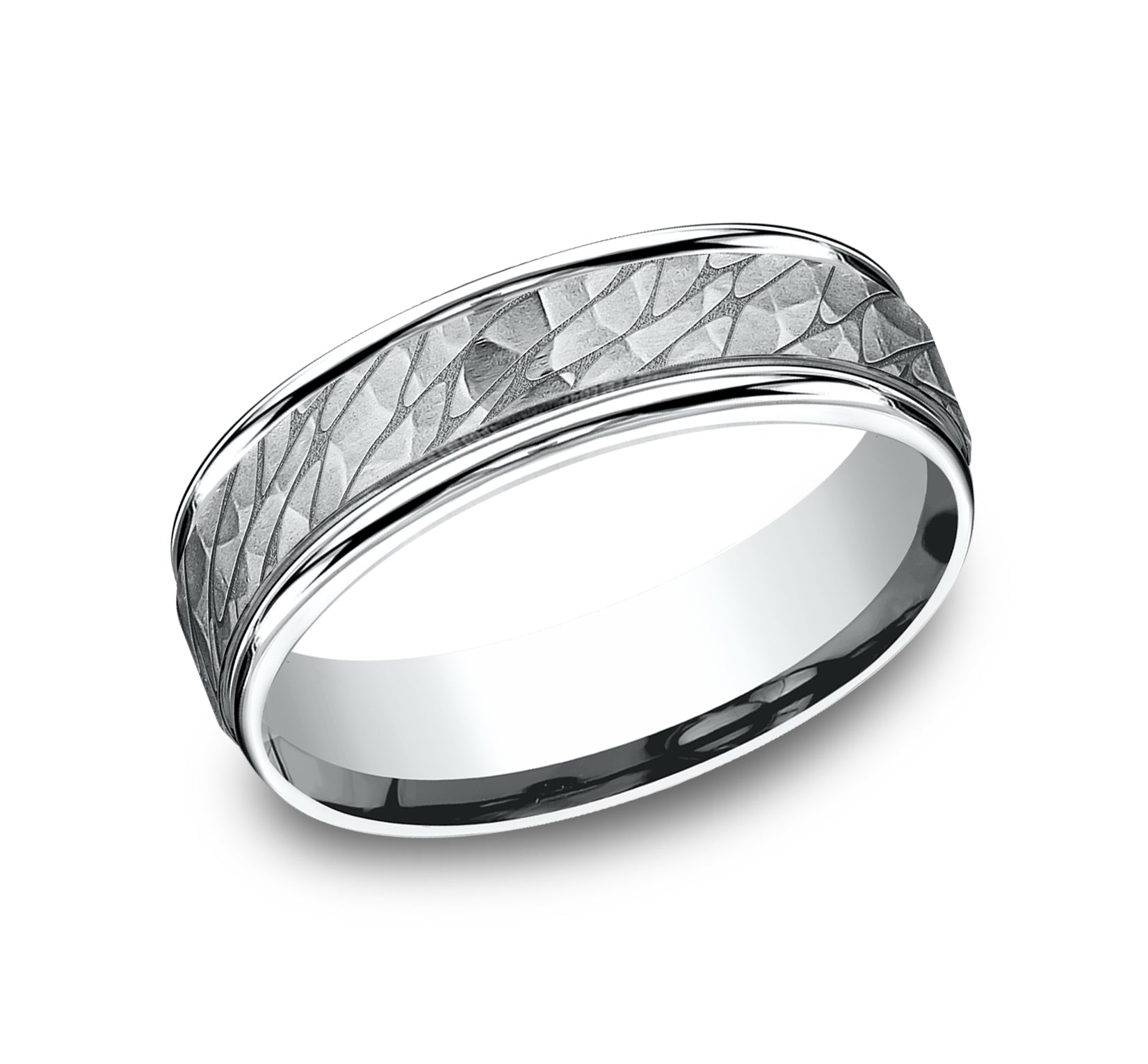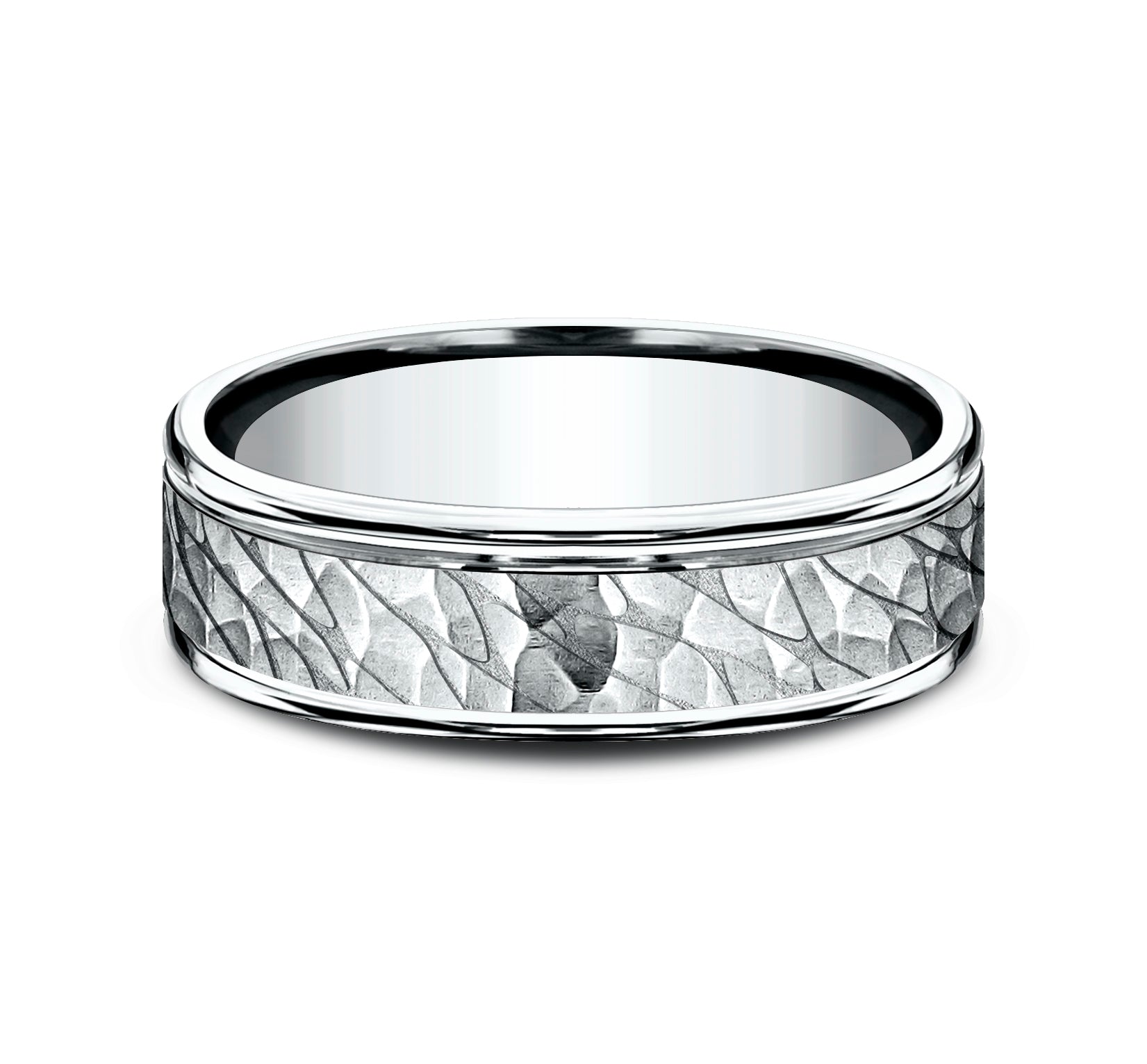 6.5mm, Comfort fit 14K White Gold Pebble pattern with hammered finish, polished round edges