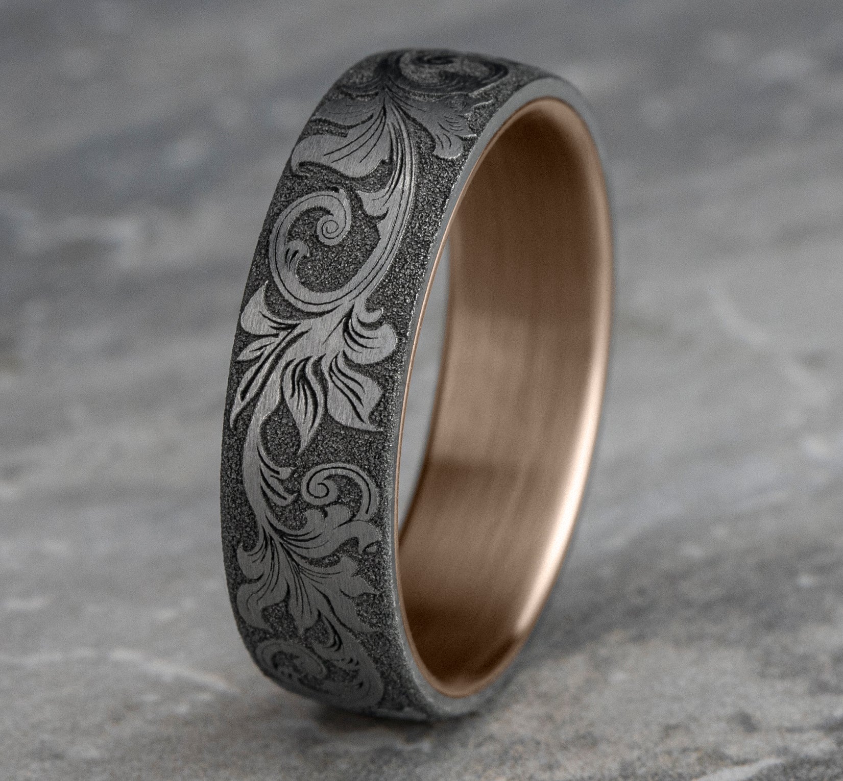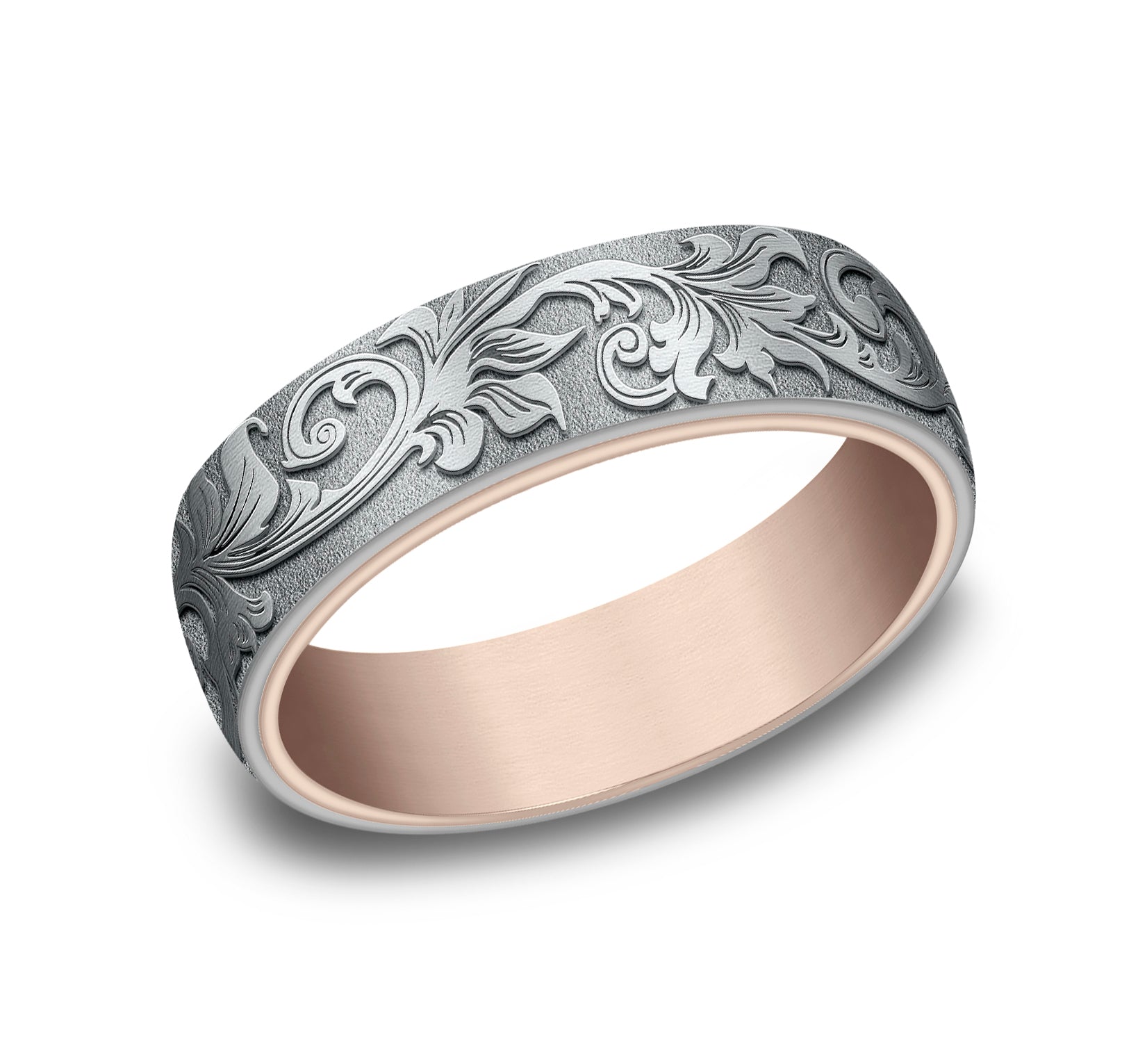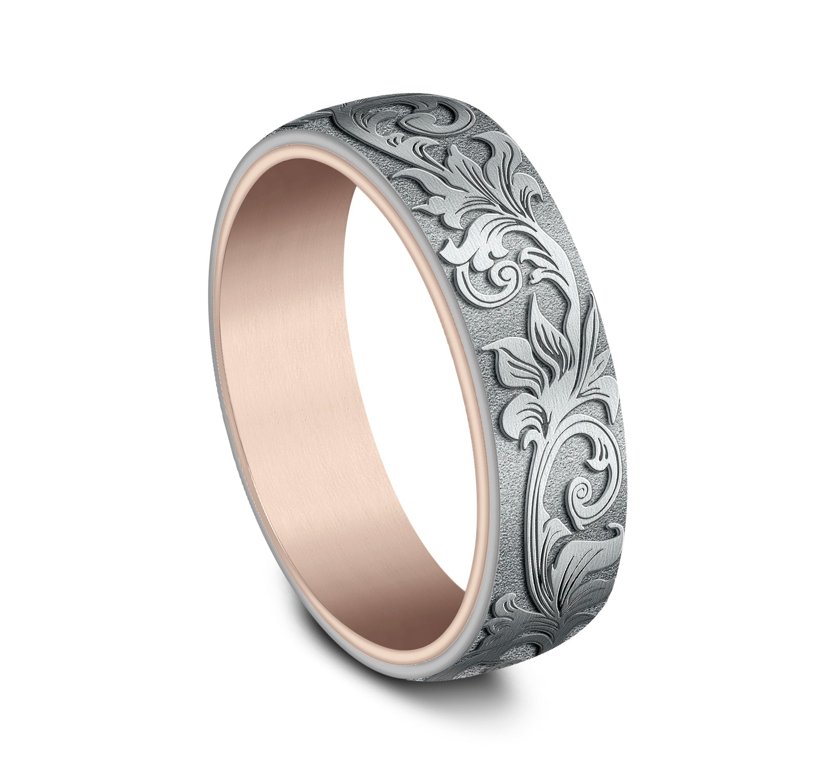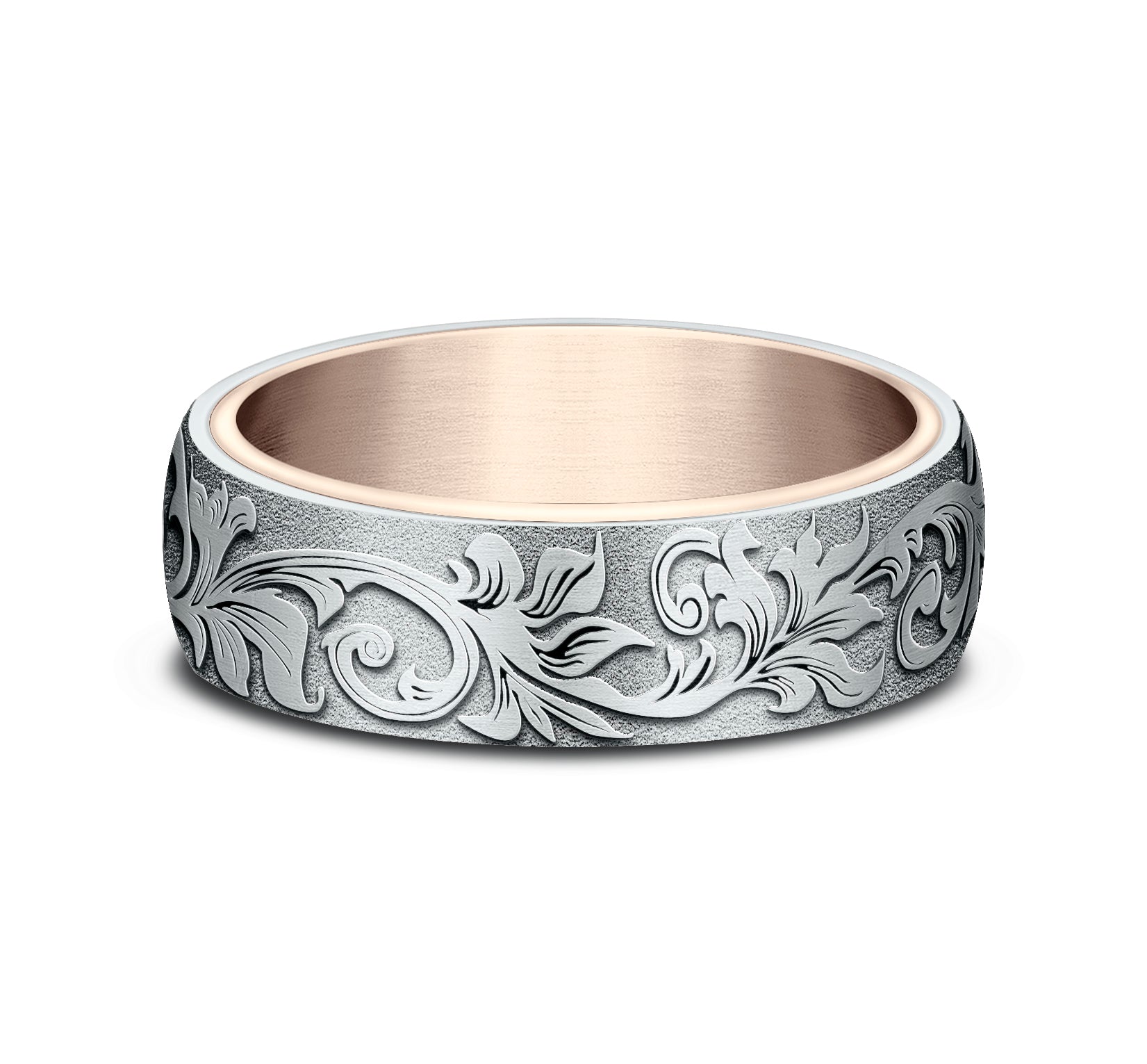6.5mm, Comfort fit 14K Rose and White Gold Vintage script pattern