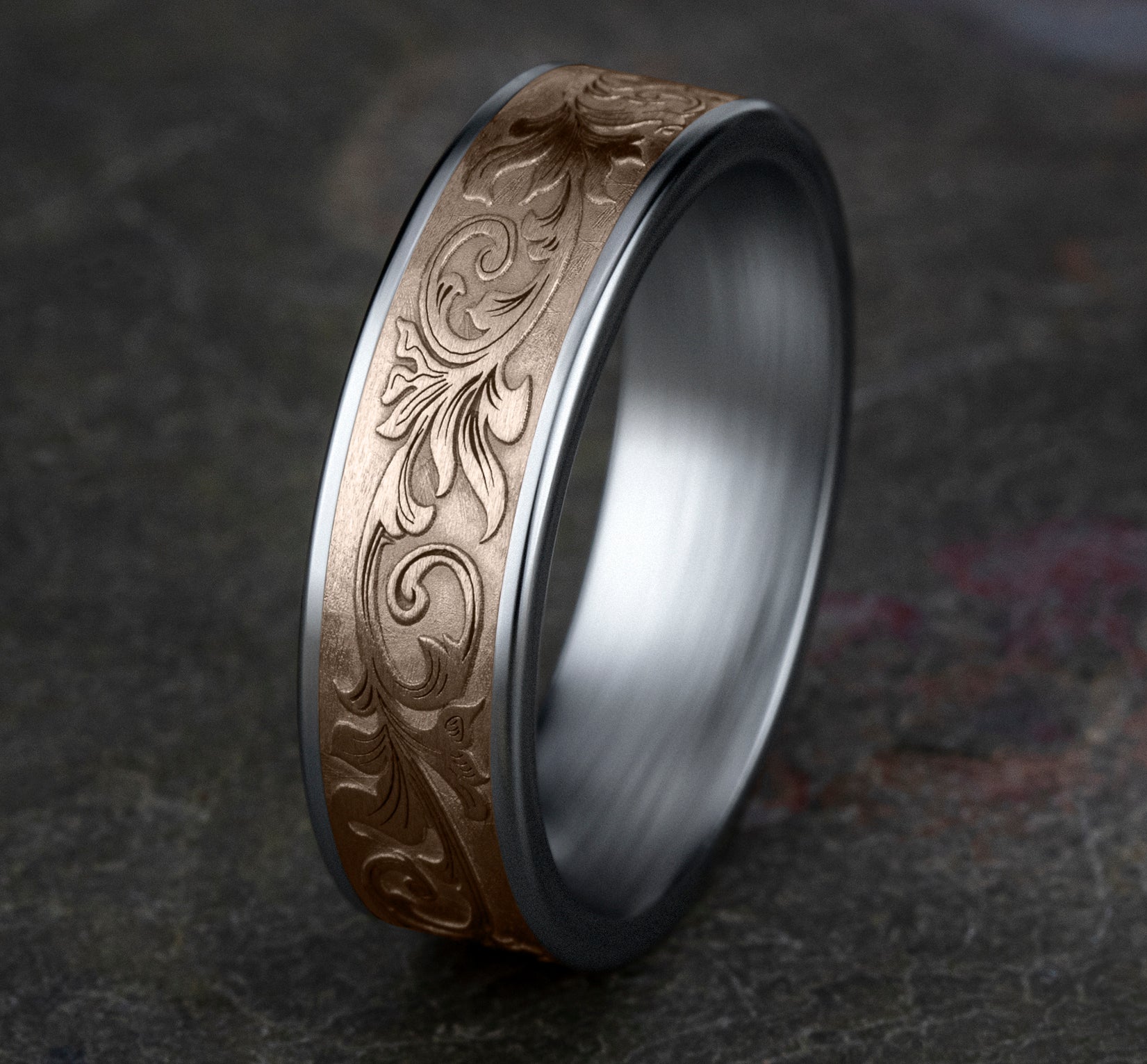 6.5mm, Comfort fit 14K White and Rose Gold Vintage script pattern, thin edges