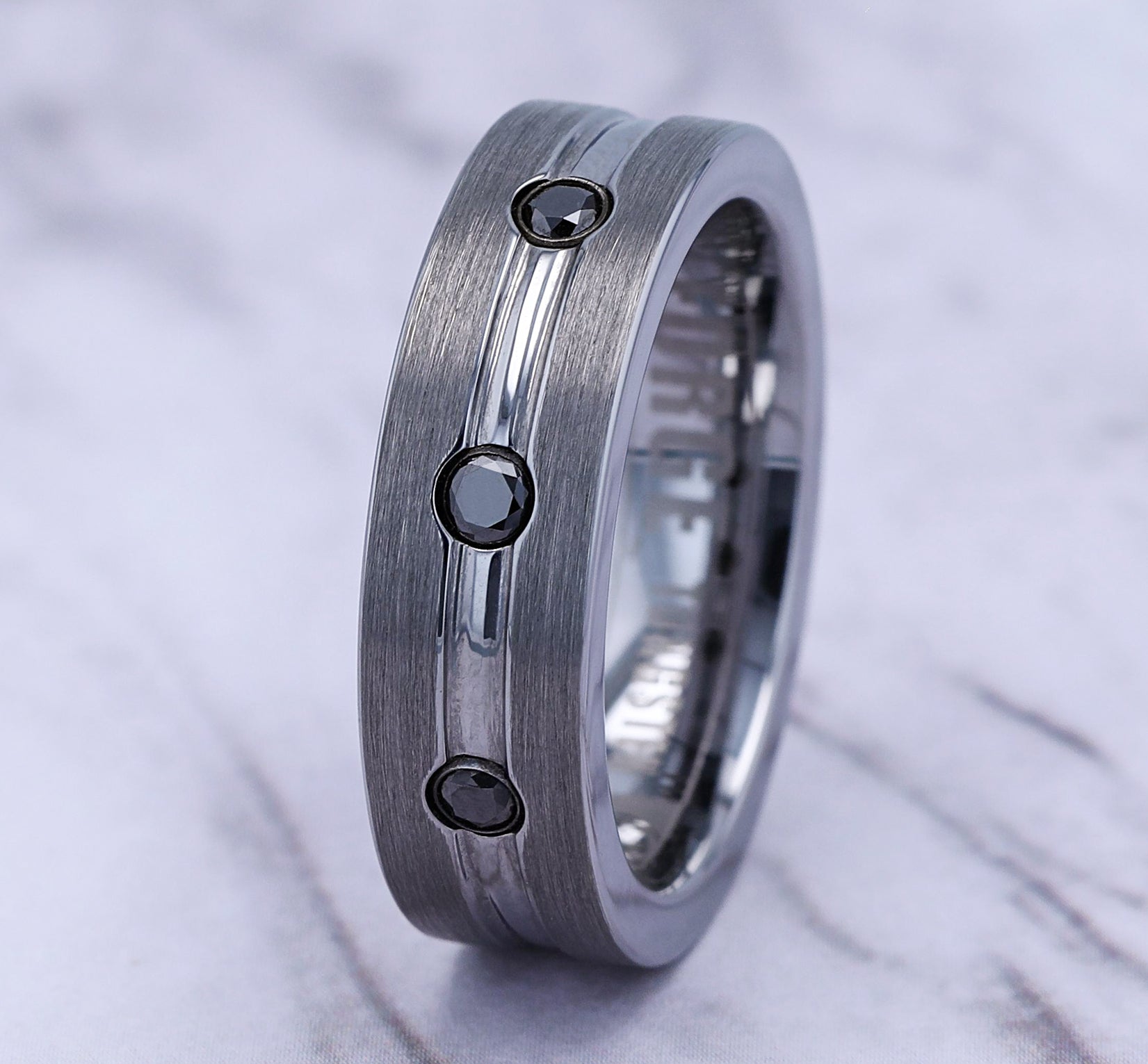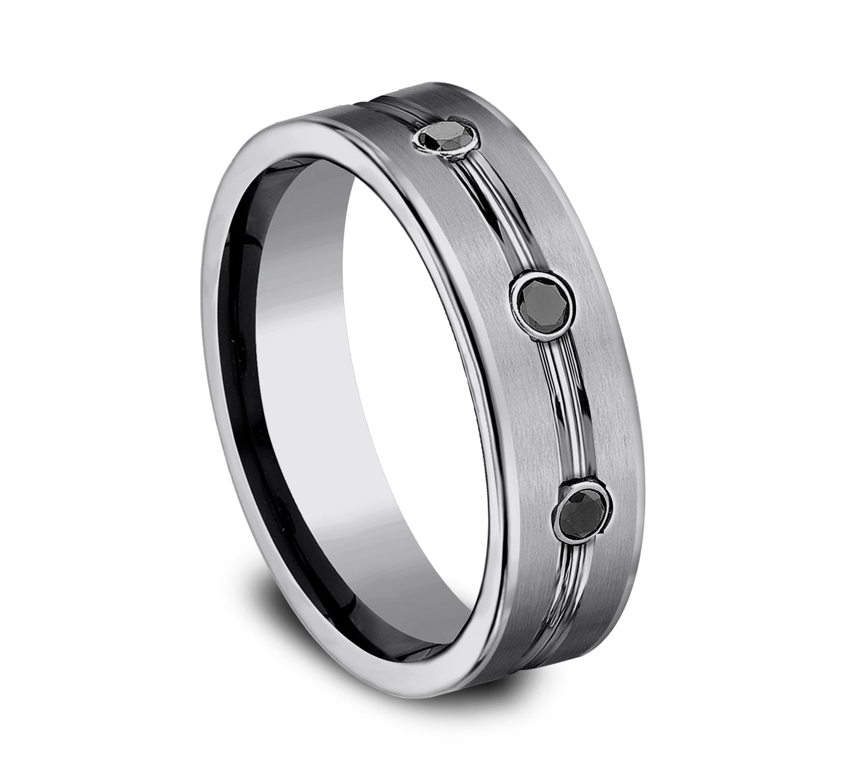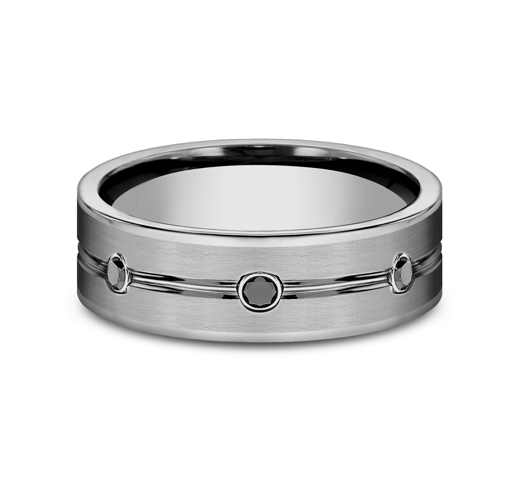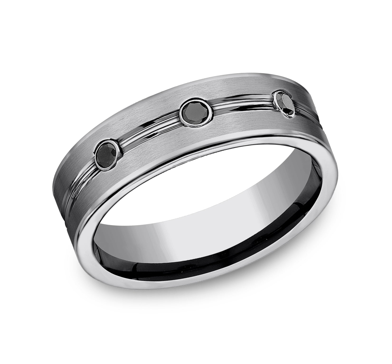 7mm, Comfort fit Tungsten Satin center, polished double center cuts with black diamonds 3 burnish set black diamonds Carat weight is .20ct