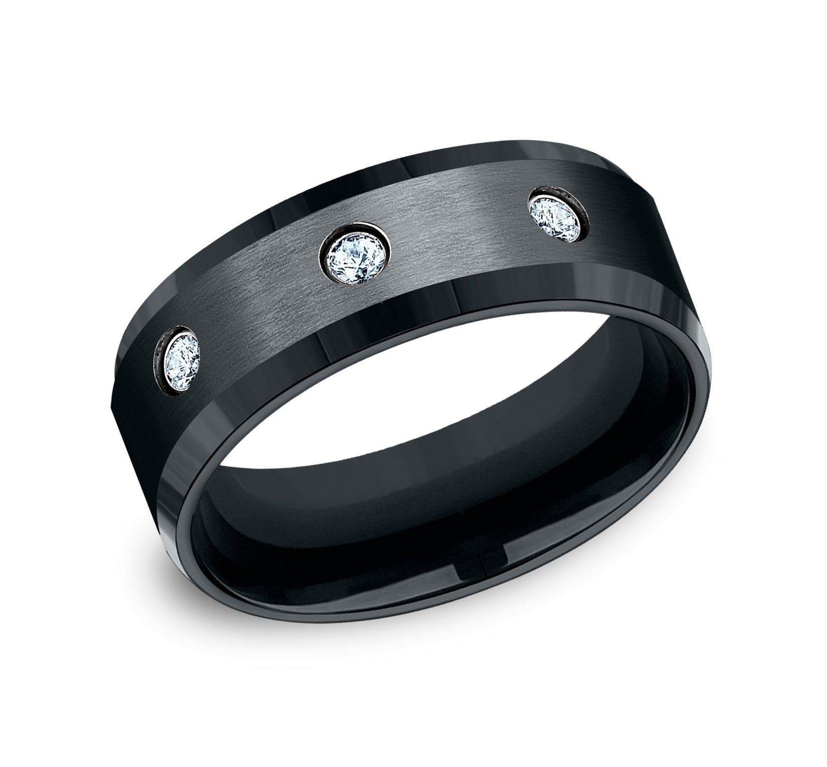 8mm, Comfort fit Black Cobalt Satin finish center, polished bevel edges 3 burnish set diamonds Carat weight is .18ct