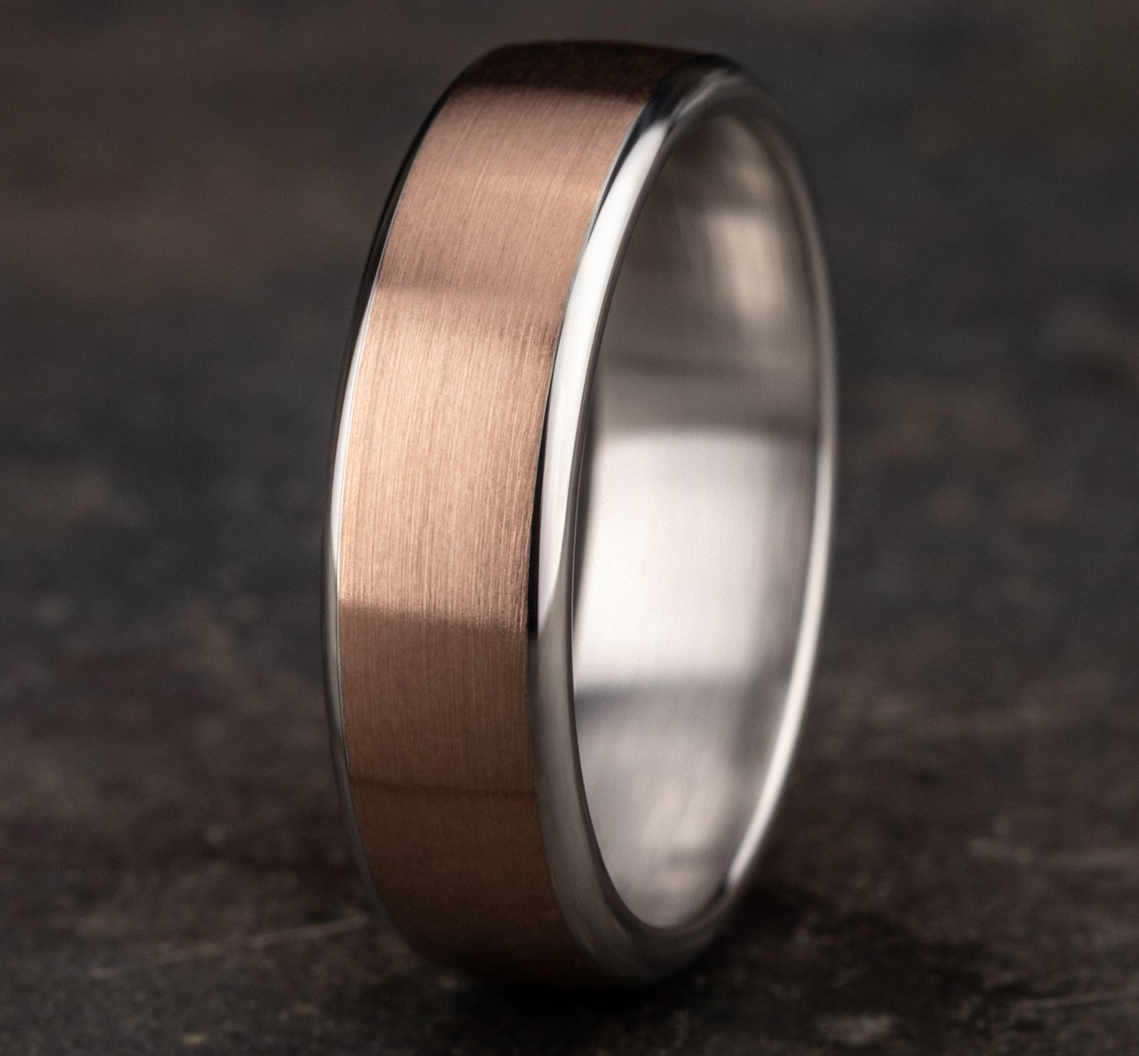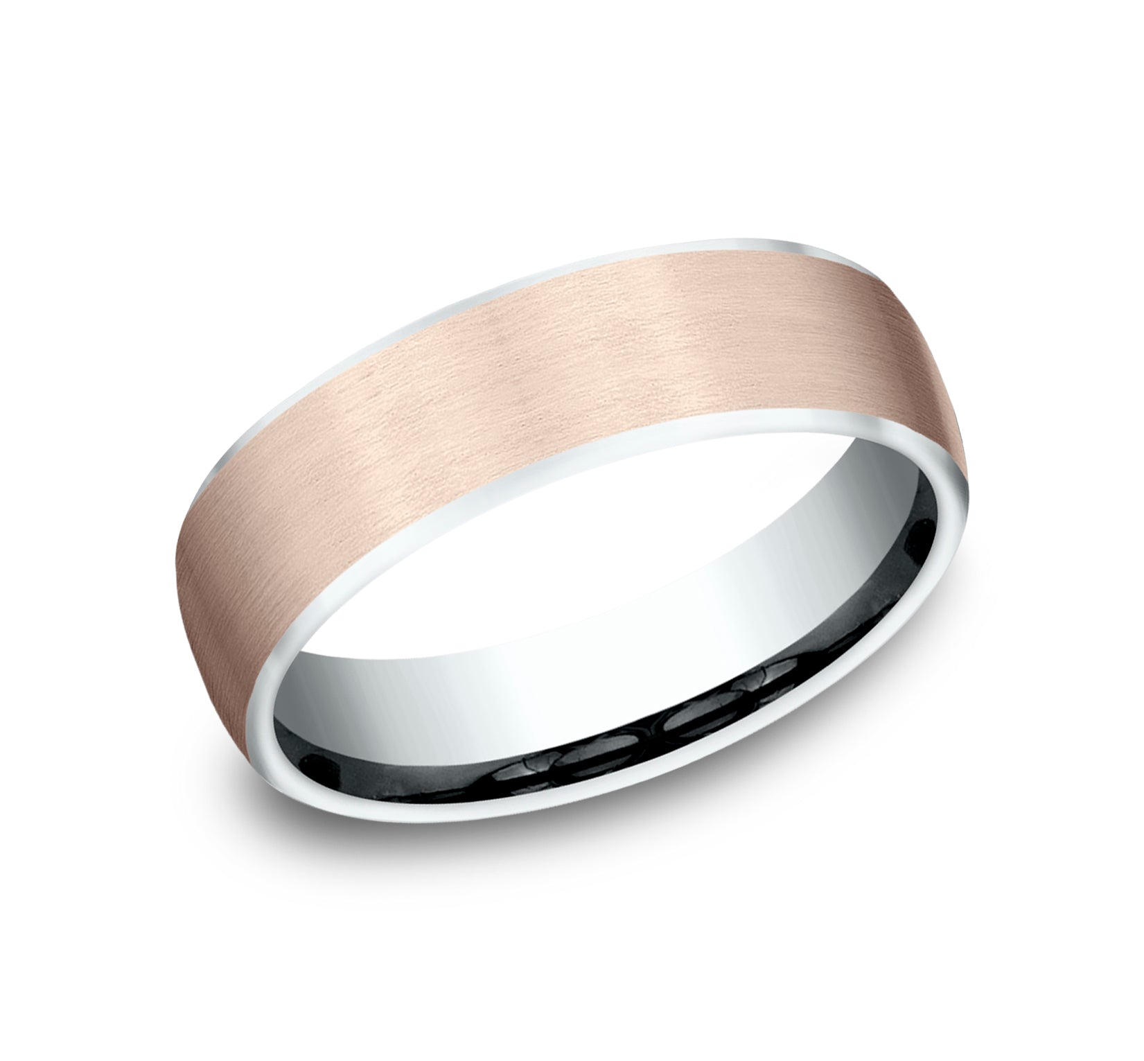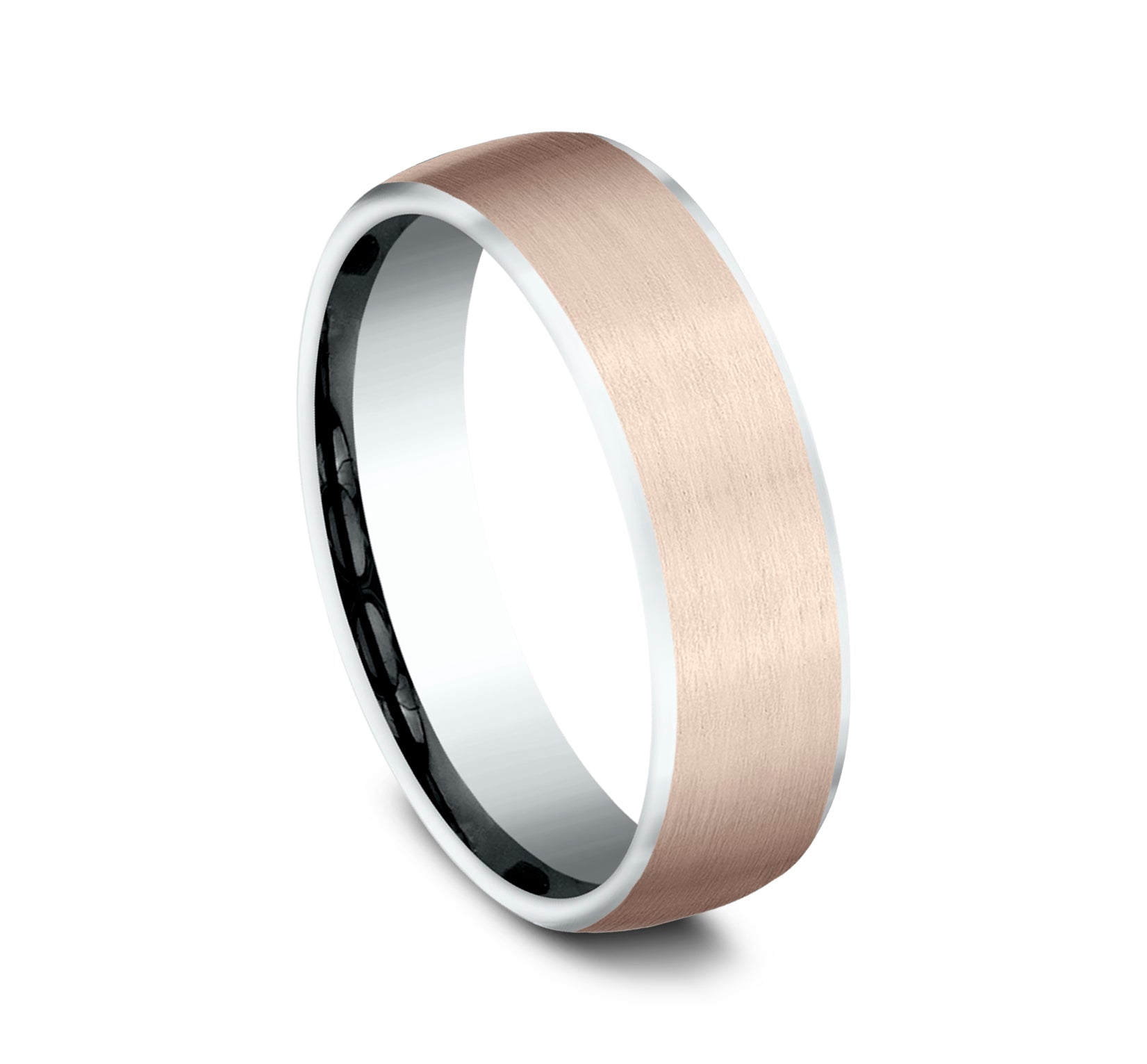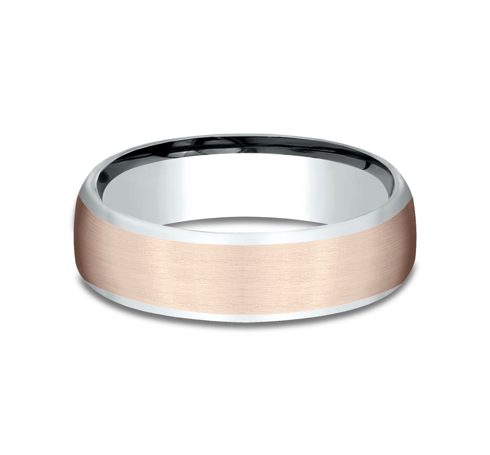 6.5mm, European comfort fit 14K White and Rose Gold Satin finish, contrasting edges